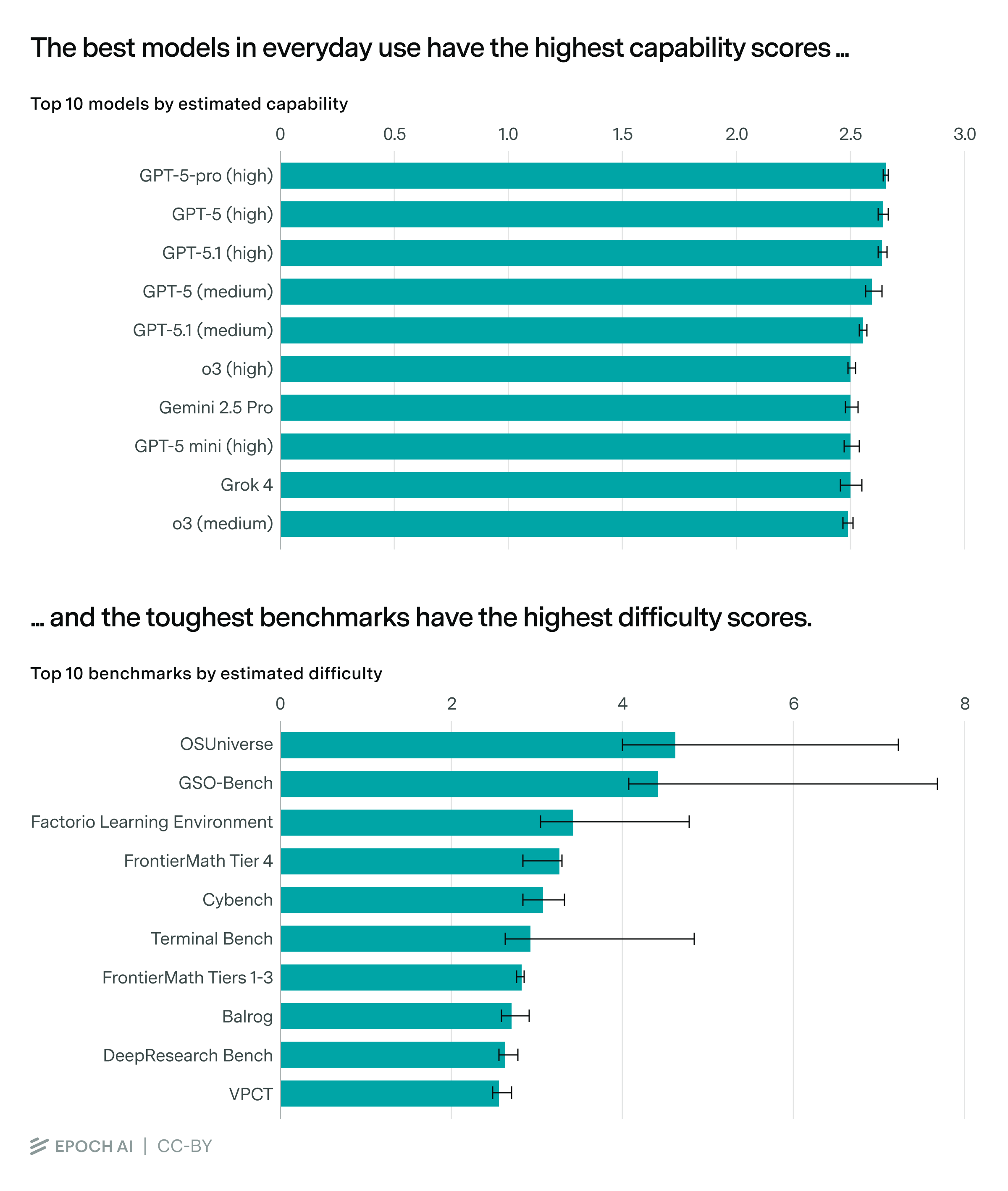 Yet reassuringly, it provides a plausible ranking of model capabilities and benchmark difficulties, with models like GPT-5.1 and Gemini 2.5 Pro near the state-of-the-art.2 This matches our intuitions from evaluations and using these models in practice,