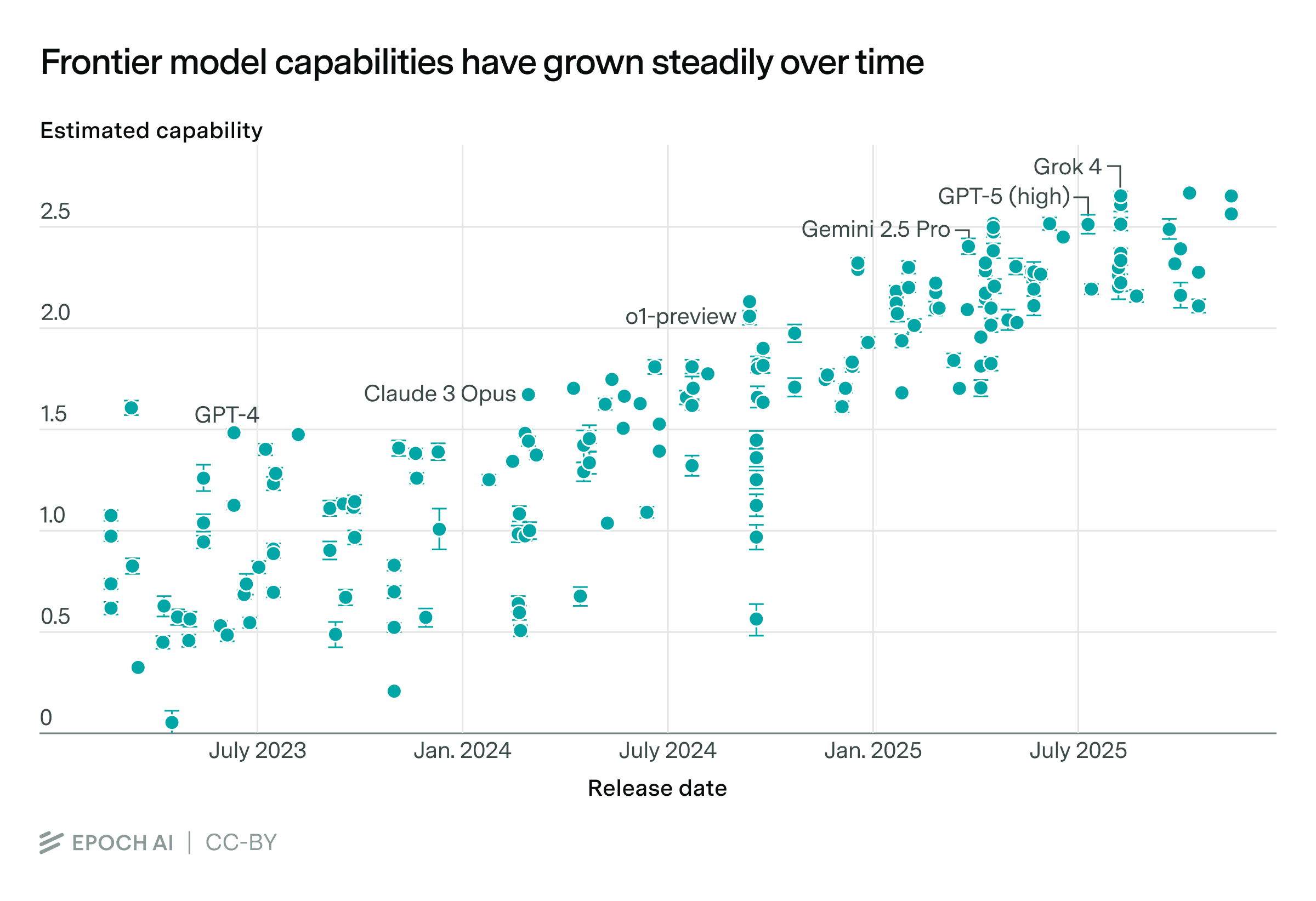 Our framework also lets us see how model capabilities have changed over time. On average, across models that push the state of the art in capabilities, the annual improvement is about 0.6 units per year. That’s as big of capabilities improvement that took place from GPT-4.5 to GPT-5.