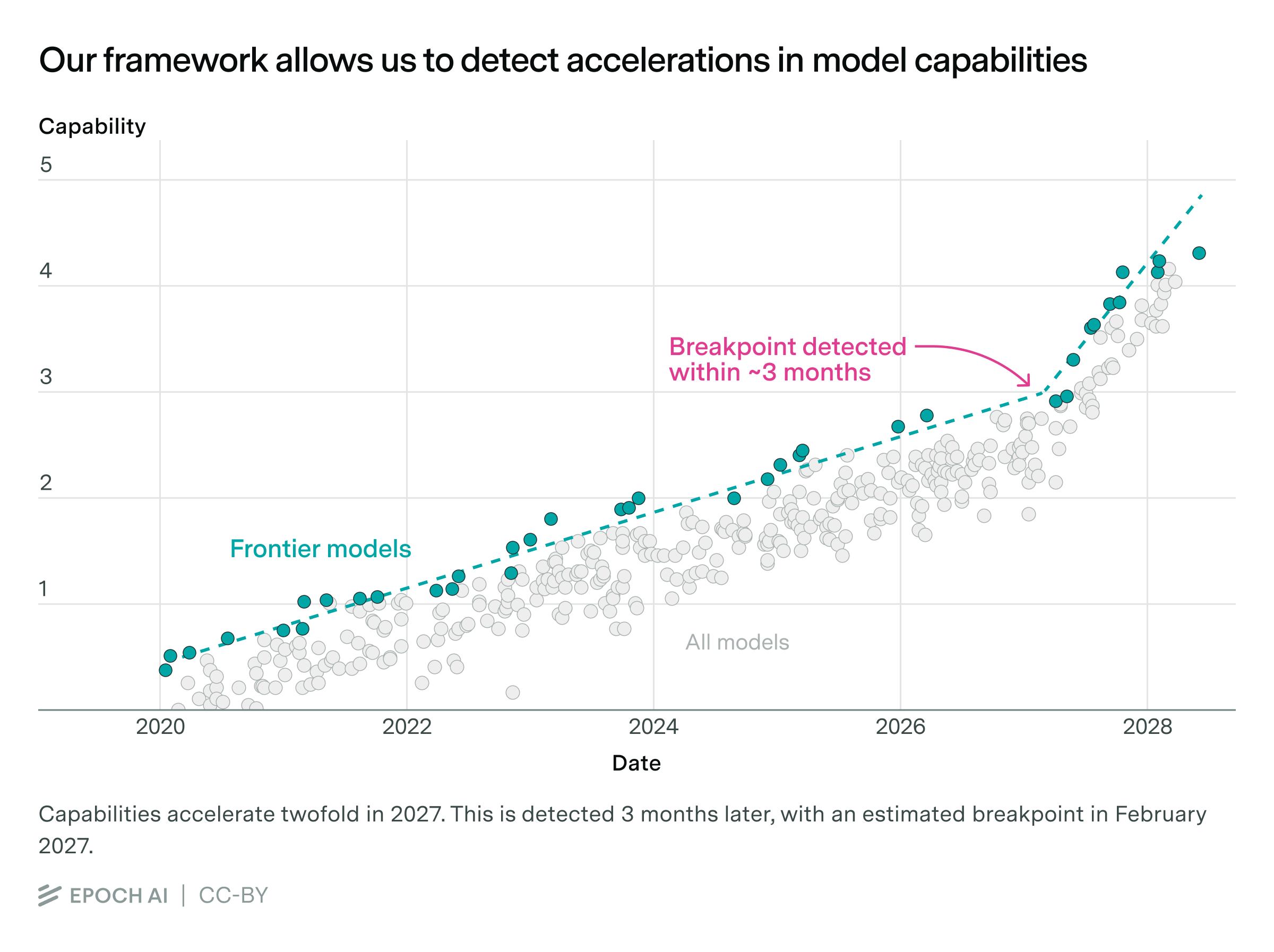 - Improve how we detect rapid capability accelerations — for example, our paper focuses on a simple scenario with a single breakpoint marking the start of the acceleration. But real accelerations might be more continuous, and need methods that focus on that more directly.