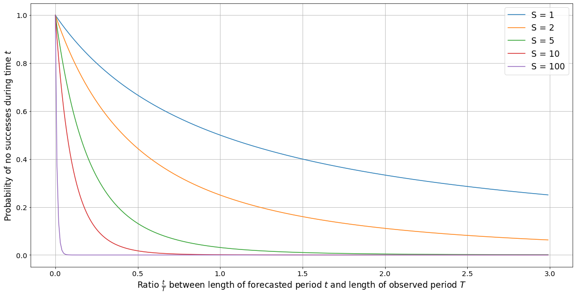 The naive approach of subdividing \(T\) into a number of trials does not behave as we would like. However, we can estimate the probability of no successes happening during an additional \(t\) time as \((1+\frac{t}{T})^{-S}\).