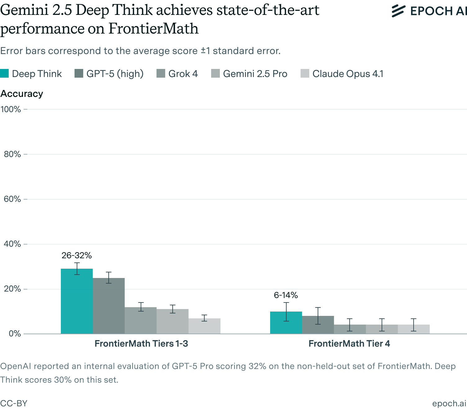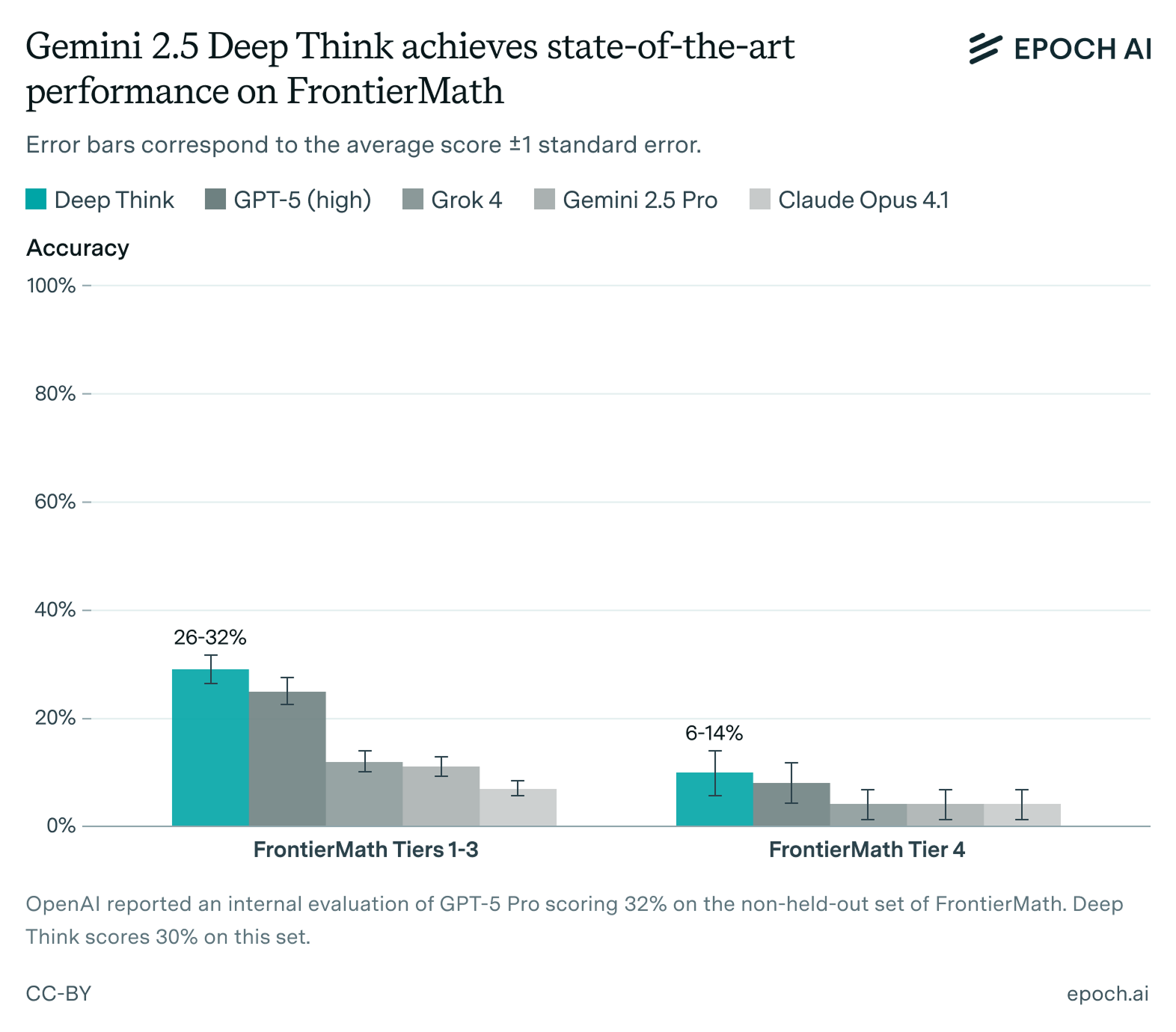 The Deep Think model evaluated in this report is a variant of Google’s IMO gold model. According to Google’s internal evaluations, this version scores 61% on the 2025 IMO—a bronze medal-equivalent score. Unfortunately, as we have written previously, the problem distribution on the 2025 IMO was not particularly informative. Five problems were easy-to-medium difficulty (by IMO standards) and one problem was extremely hard. All the gold-medal models got full marks on the first five problems and no marks on the sixth, i.e. a score of 83%.8 Even regular Gemini 2.5 Pro already did reasonably well, scoring 32% on MathArena’s best-of-32 evaluation, a result that represents substantial partial credit on three of the five easy-to-medium problems. We argued that the remaining headroom on these five problems wasn’t particularly interesting. In light of the above, we don’t find Deep Think’s score of 61% particularly informative one way or another.