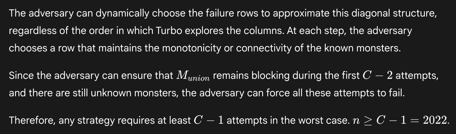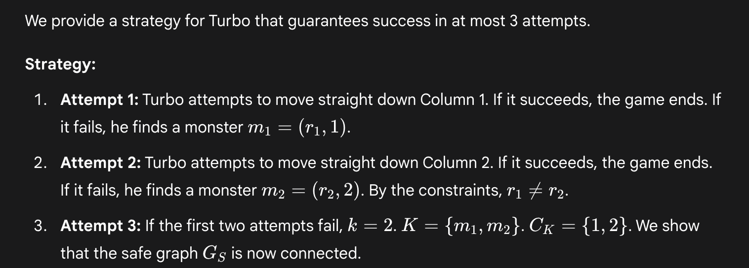 Interestingly, in these solutions Deep Think does seem to realize that the arrangement of monsters in a single long diagonal is somehow relevant—which is true. However, Deep Think takes this too far. In particular, it misses that Turbo can devise a clever attempt that will either succeed straight away, or else reveal a pattern that can be exploited to succeed thereafter, regardless of where the monsters are.