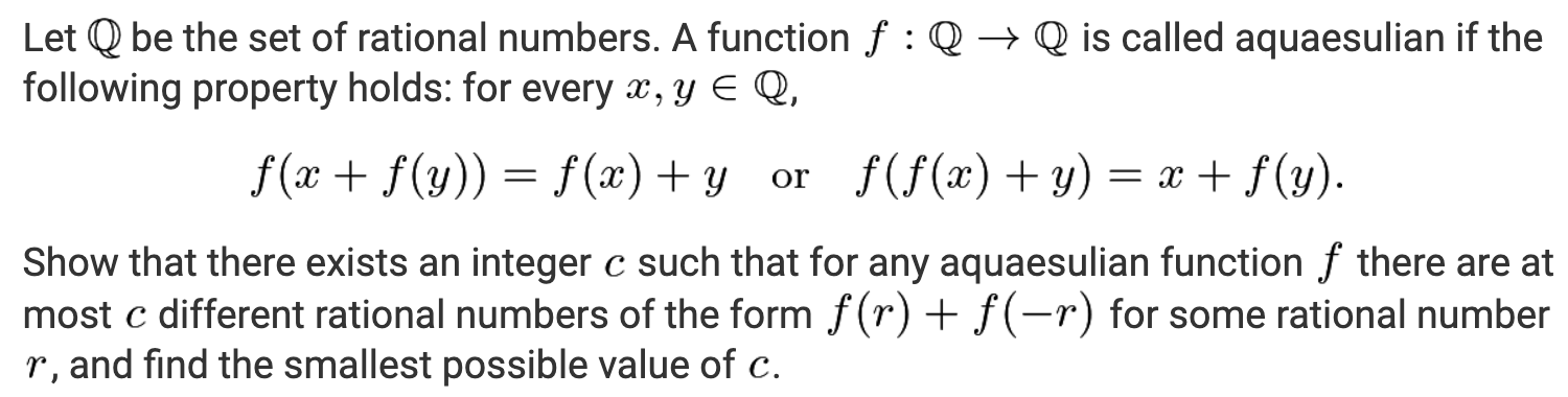 The “or” in the functional equation is unwieldy. Any proof of a general property of such an f must contend with both possibilities simultaneously. This problem is notable for being the hardest problem solved by AlphaProof, Google’s system from 2024 that generated proofs in the formal theorem-proving language Lean.12 A Google representative has stated that AlphaProof was used to generate training data for Deep Think, so perhaps this problem would be within its reach.