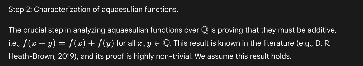 There is some partial progress across these attempts. Coming up with an example that gives c=2 is non-trivial. In some of its other solutions, Deep Think does manage to prove some basic properties about aquaesulian functions f, including that f(0)=0, f is bijective, and -f(-f(x)) = x. Then again, it also attempts to prove several incorrect properties, such as that f(f(x))=x and that f(x+y) = f(x)+f(y).