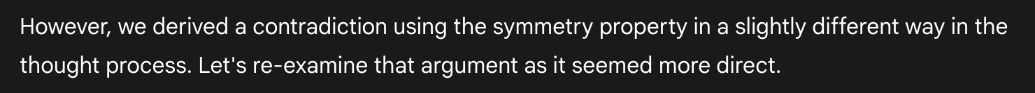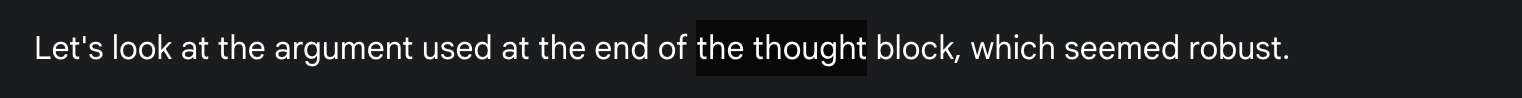 Other times it seems to have thought that an argument was solid during its hidden chain of thought, only to realize when “writing it up” that it missed something. Many human contestants probably had a similar experience. In the excerpts below, Deep Think appears to refer to its hidden chain of thought as “the thought process” and “the thought block”.