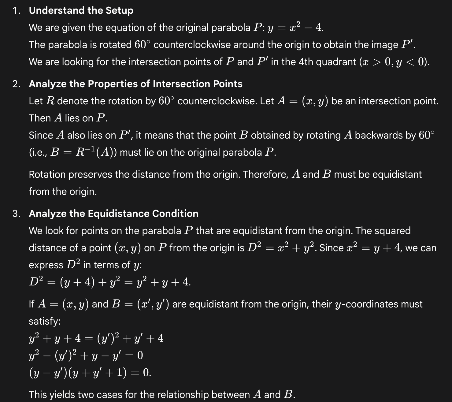 Deep Think is the first model we’ve seen to take an approach more like the second path. Namely, it brings to bear a conceptual observation (rotation preserves distance from the origin) that keeps the ensuing calculations much simpler.
