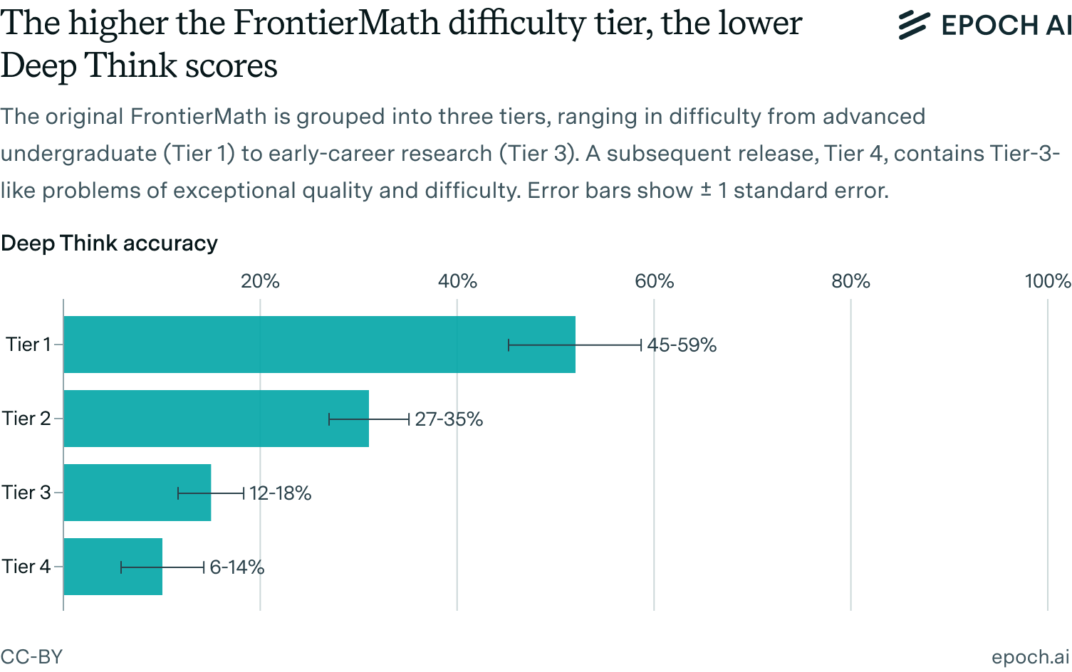 In any case, Deep Think has yet to master the skills needed to solve the harder FrontierMath problems. Looking at the overall tiers, which represent an all-things-considered difficulty assessment, Deep Think solved only about half of the problems in the easiest tier and fewer problems as the tiers got harder.
