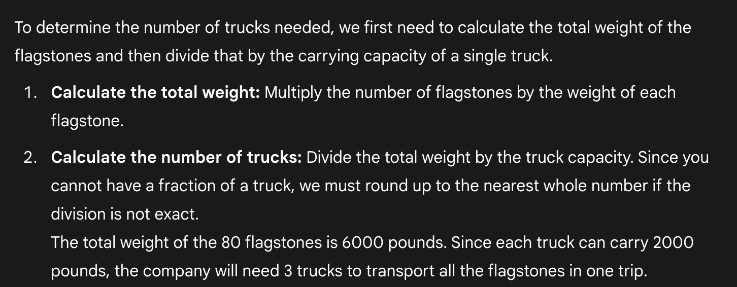 (75 stones) × (80 pounds/stone) ÷ (2000 pounds/truck) = 3 trucks