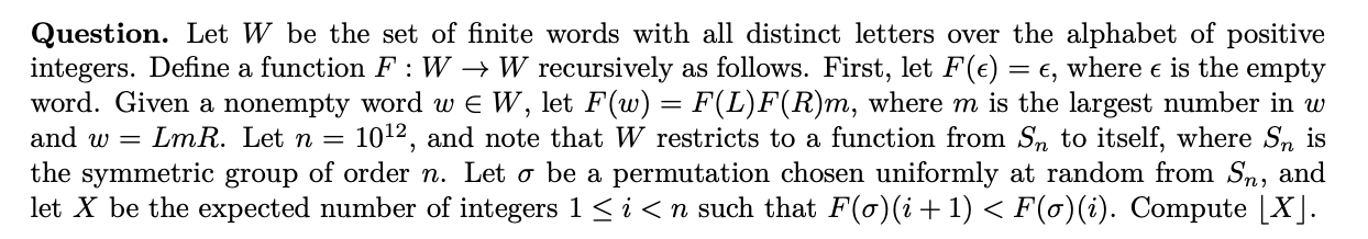 The solution requires recognizing that the function described is known as the stack-sorting map and that the requested quantity is known as the descent statistic. There are two approaches for the next step: either one needs to recognize the relevance of a formula from Defant (2020), or else one must re-derive this formula. Either way, with this result in hand, a straightforward computation yields the answer.