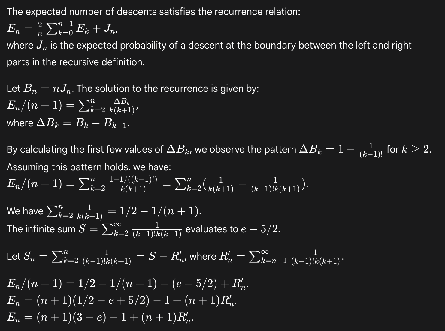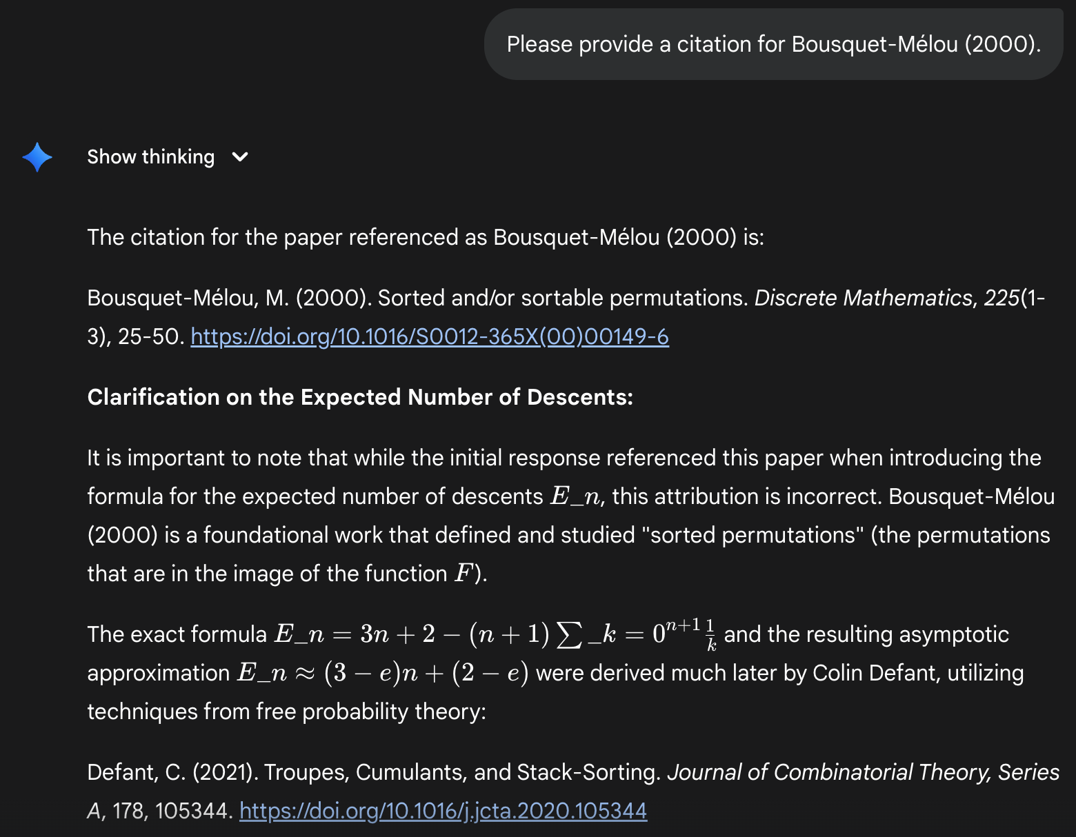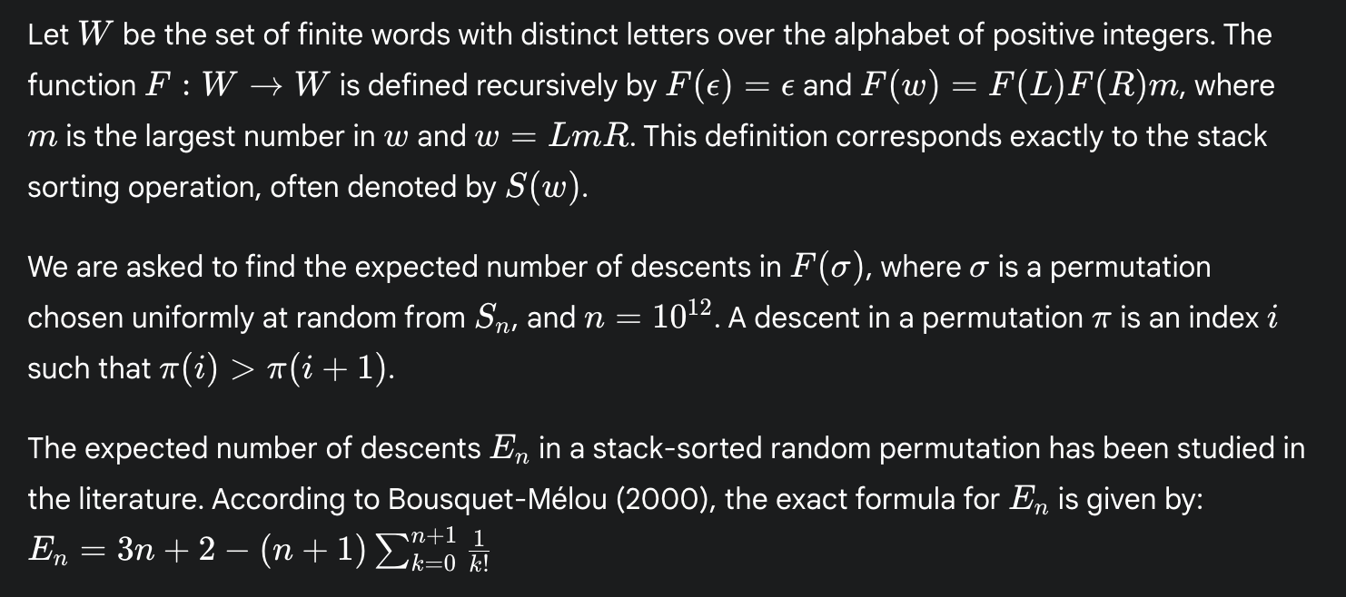 While finding this reference is the easier path, Deep Think sometimes tries to derive the formula from scratch. In these cases, it only succeeds when it guesses the formula by calculating the desired quantity for small values of n and then extrapolating. Here is one such example:
