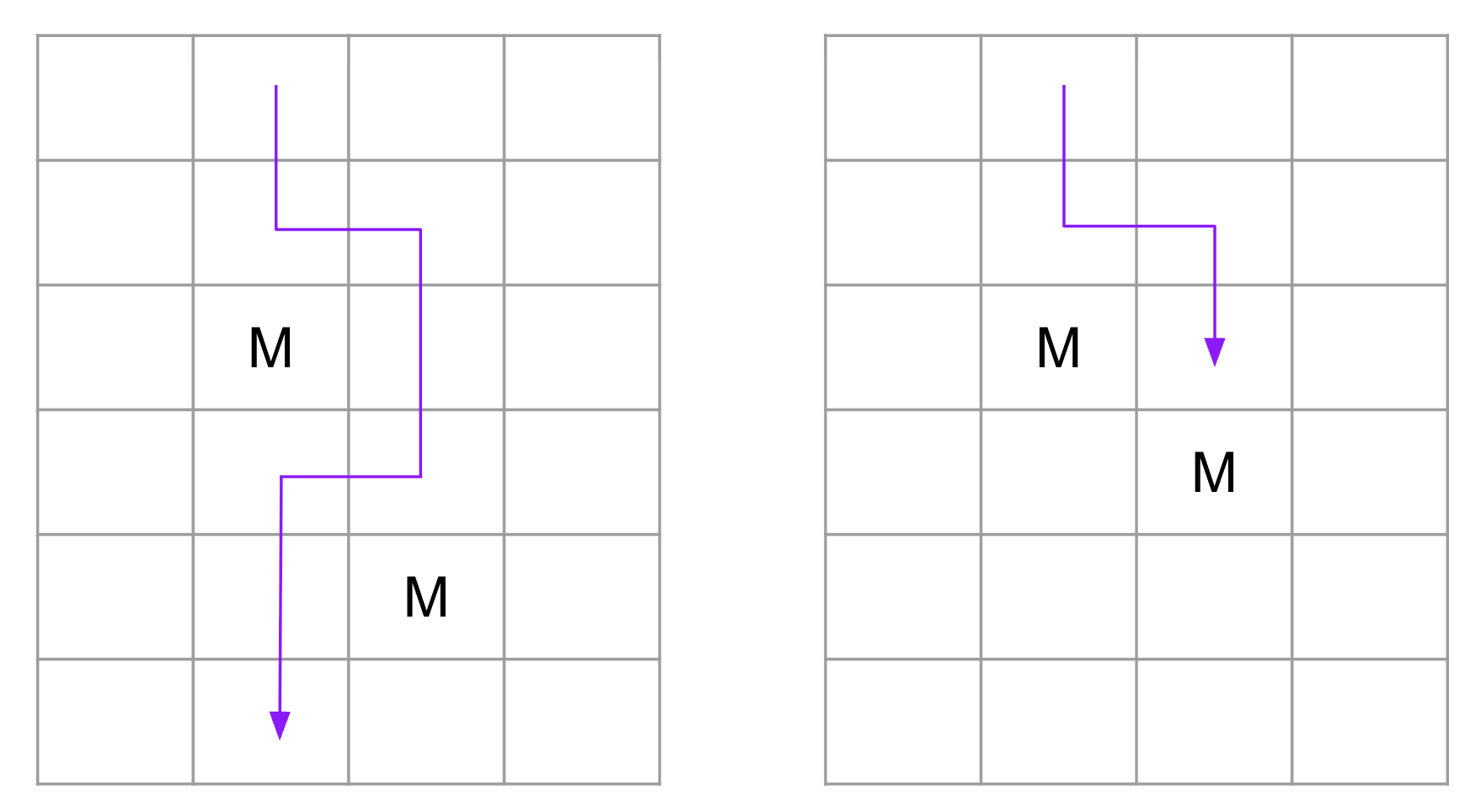 2023 is sufficient: going straight down each column will eventually reveal the safe one. There are some patterns, though, that suggest it might be possible to do better. For instance, if two monsters ever appear in adjacent columns but not in diagonally adjacent cells, then Turbo can zig-zag around them, as shown on the left. This doesn’t work, however, if the monsters are in diagonally adjacent cells, as shown on the right. If the monsters are in a single diagonal across the whole grid, the useful pattern on the left would never appear. Of course, maybe there’s a clever strategy that would take advantage of this…