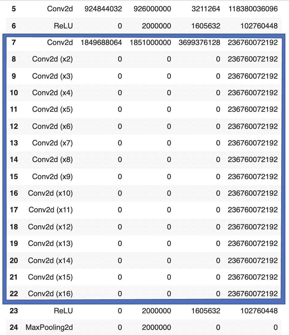 This double-counting can happen in more extreme versions. In the forward pass of VGG13, for example, profiler_nvtx counts a single operation 16 times. That is 15 times too often. Obviously, this distorts the results.