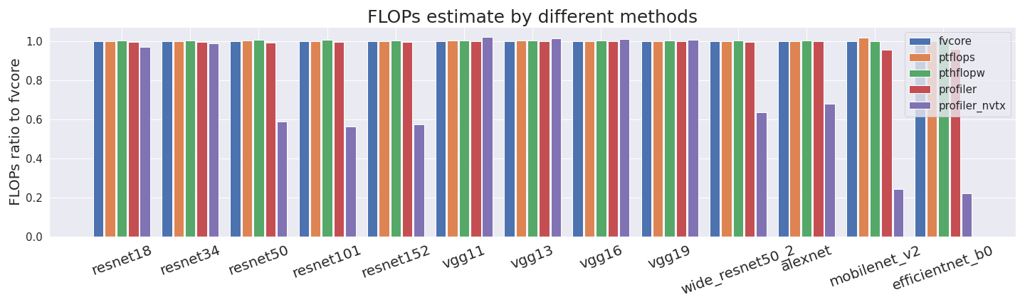 One problem for the estimation of FLOP is that fvcore, ptflops and pthflops seem to count a Fused Multiply Add (FMA) as one operation while the profiler methods count it as 2. Since basically all operations in NNs are FMAs that means we can just divide all profiler estimates by 2. We already applied this division to all estimates, so you don’t have to do it mentally. However, this is one potential source for errors since some operations might not be FMAs.
