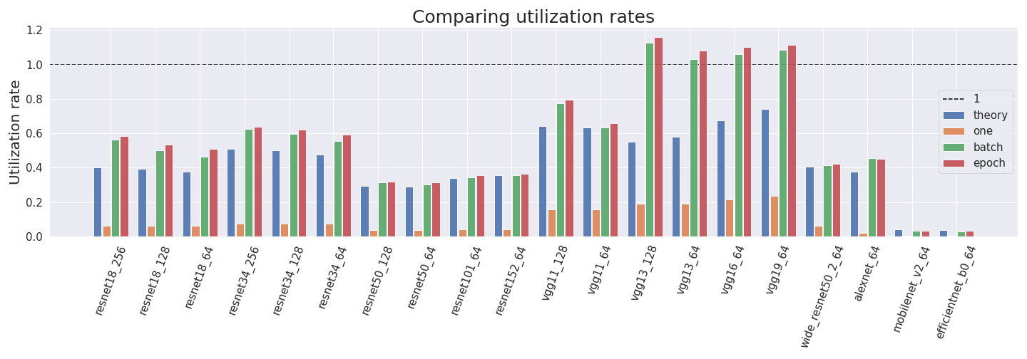 We can see that the utilization rates predicted by the theory are often comparable to the empirical measurements for batch and epoch. We can also see that the batch and epoch versions are usually very comparable while just forwarding and backwarding one sample is much less efficient. This is expected since the reason for larger batch sizes is that they utilize the GPU more efficiently.