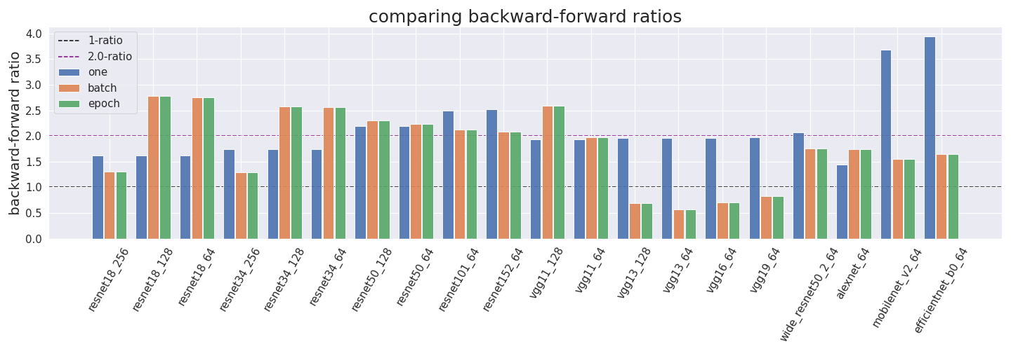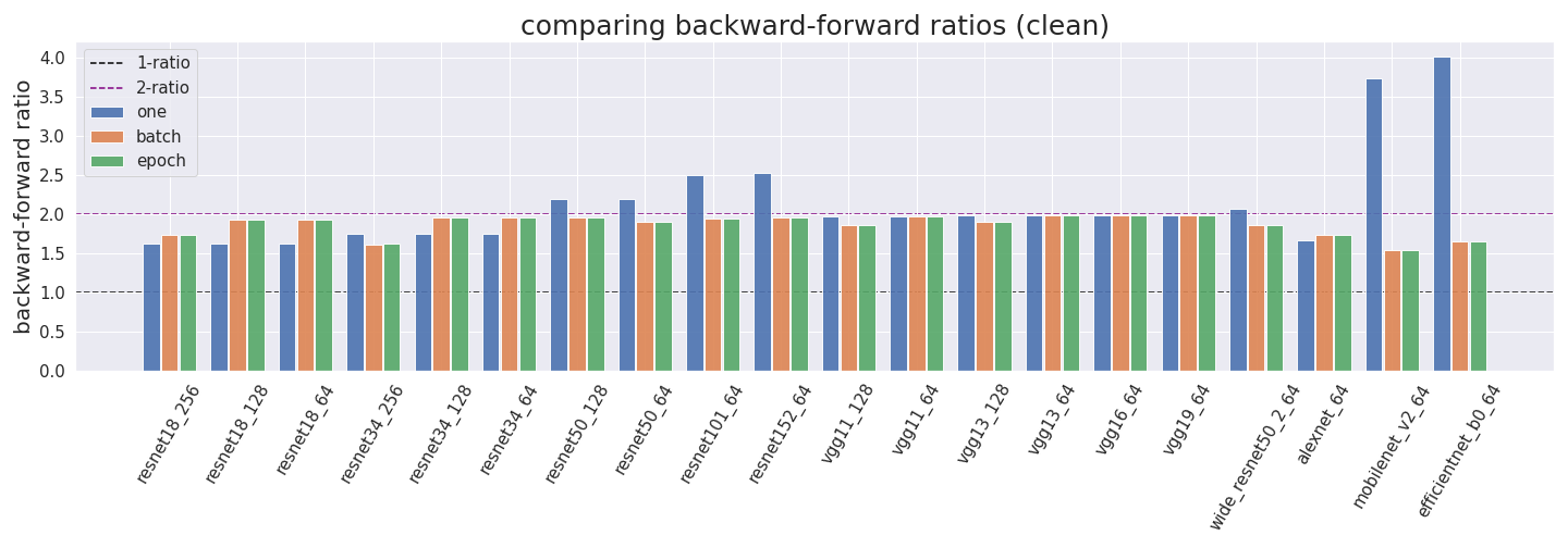 We wanted to further test this ratio empirically. To check consistency we tested these ratios for a single forward pass with batch size one (one) an entire batch (batch) and an entire epoch (epoch).