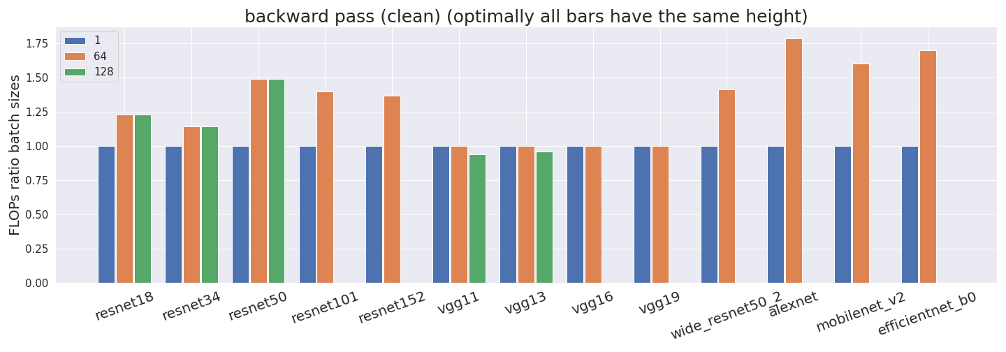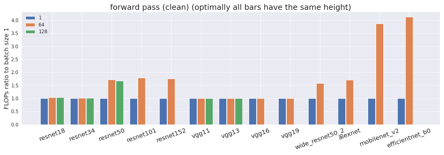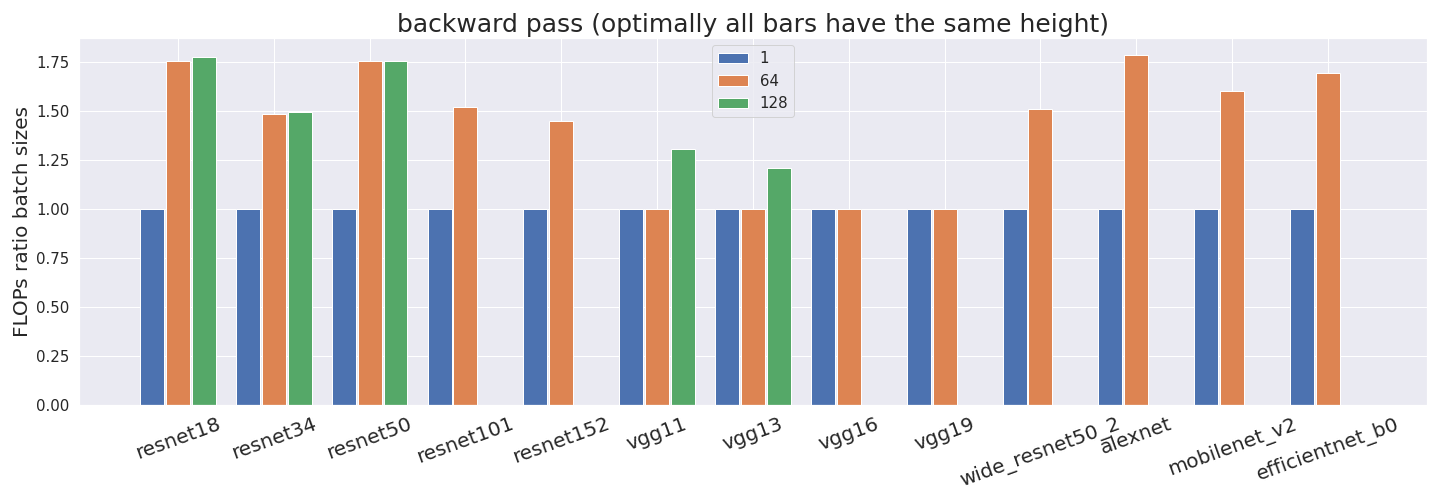 All FLOP estimates have been normalized by the batch size. Thus, if our profiler counted correctly, all bars would have exactly the same height. This is not what we observe in some networks, which suggests that something is off. Some networks don’t have estimates for a batch size of 128 since it didn’t fit into the GPU memory.