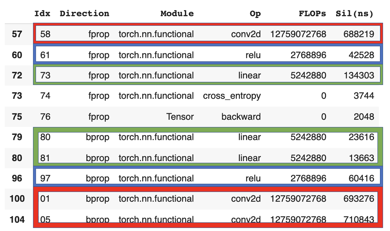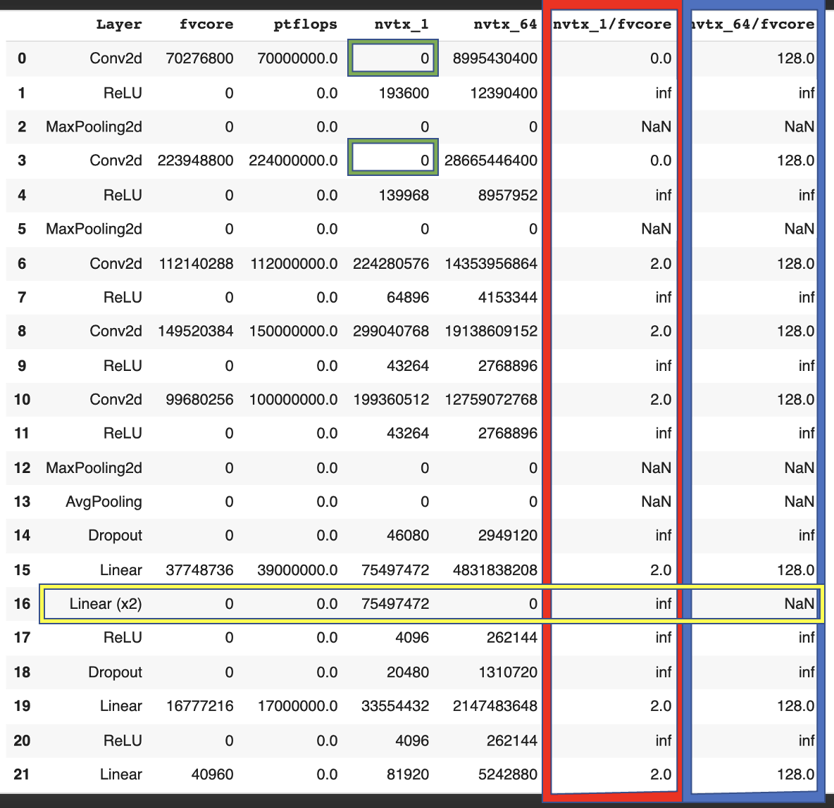 - FMAs: We find that profiler_nvtx counts exactly 2x as many FLOP as fvcore (red in table) since profiler_nvtx counts FMAs as 2 and fvcore as 1 FLOP. For the same reason, profiler_nvtx counts 128 as many operations when we use a batch size of 64 (blue in table).