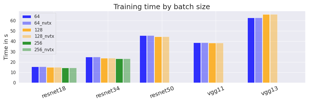 We trained some of our models with different batch sizes. We are interested in whether different batch sizes affect the time it takes to train models. We additionally compare the timings from the conventional profiler and profiler_nvtx.