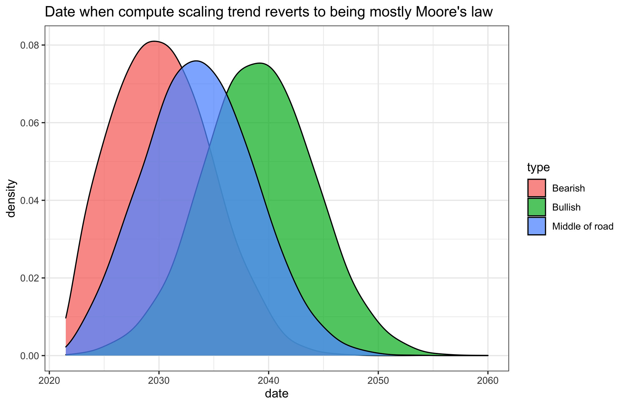 Roughly, we might say that these scenarios are represented by the following distributions over ‘reversion dates’, i.e. dates when the scaling trends are more similar to Moore’s law than they are to the current fast trend.