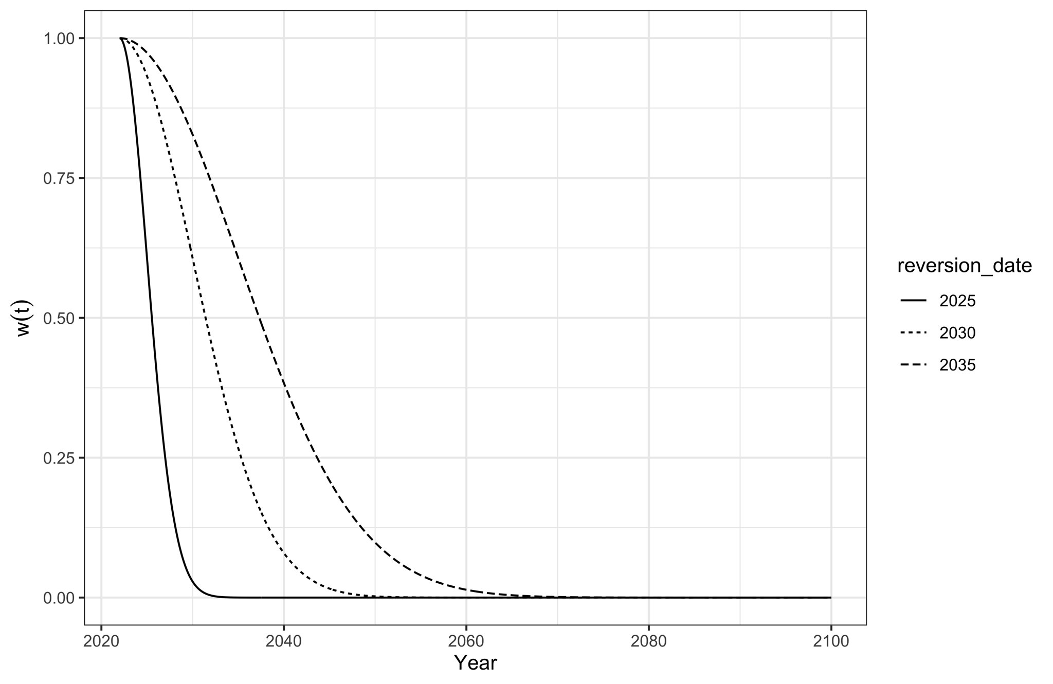 \[\begin{equation} w(t) = \exp\bigg(\frac{(t-2022)^2}{2(\text{reversion date}-2022)^2}\bigg)^{-1}. \end{equation}\]Why? Well, it’s a logistic-like function with a unit-interval range, which exceeds \(1/2\) when \(t< \text{reversion date}\), equals \(1/2\) when \(t = \text{reversion date}\), and is less than \(1/2\) otherwise. This is what it looks like: