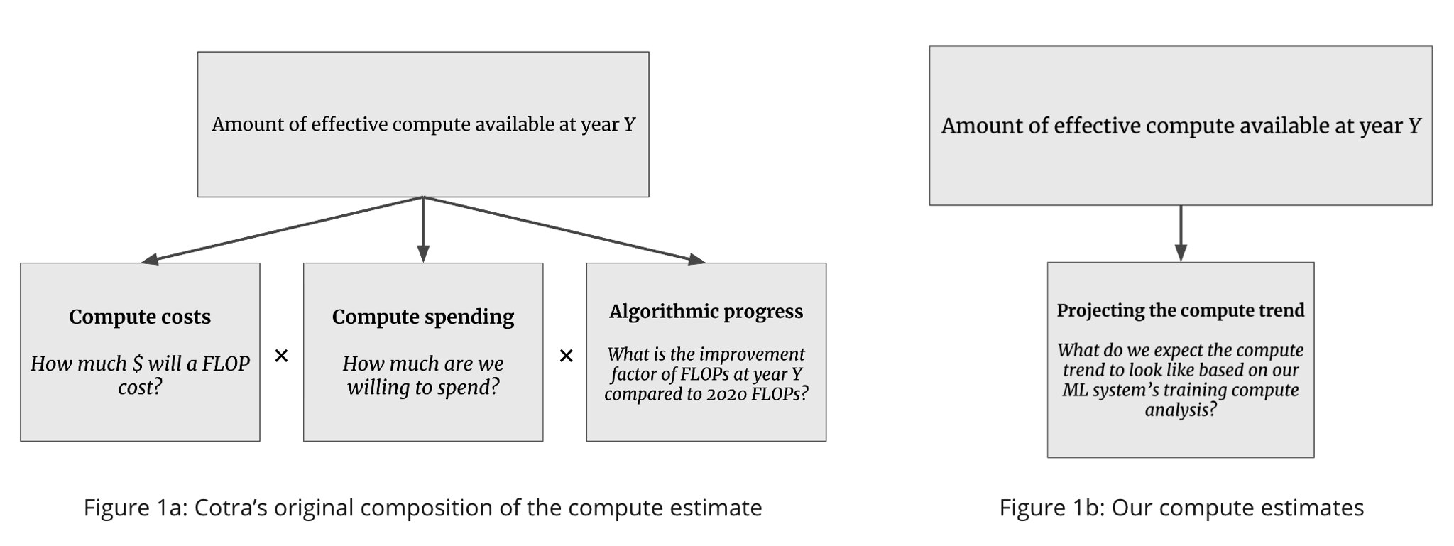 Cotra’s amount of effective compute available at year Y is broken down into forecasts of (a) compute cost, (b) compute spending, and (c) algorithimic progress. By contrast, we do not decompose the estimate, and rather project it on our previous investigation of training compute of ML milestone systems. This trend includes the willingness to spend over time including the reduced compute costs over time; however, it does not address algorithmic progress. We explicitly do not forecast the cost of compute or compute spending.
