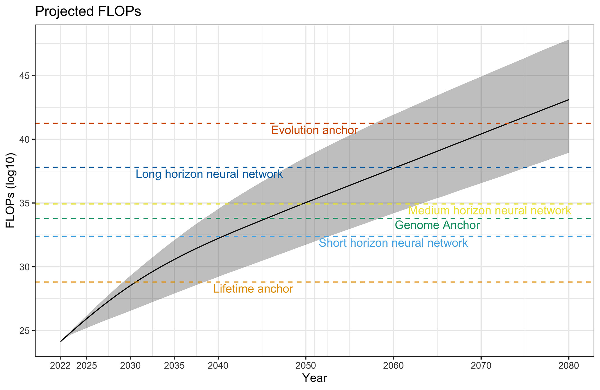 | Year | Projected FLOP used to train largest ML model | Enough for how many anchor’s median compute requirements? |