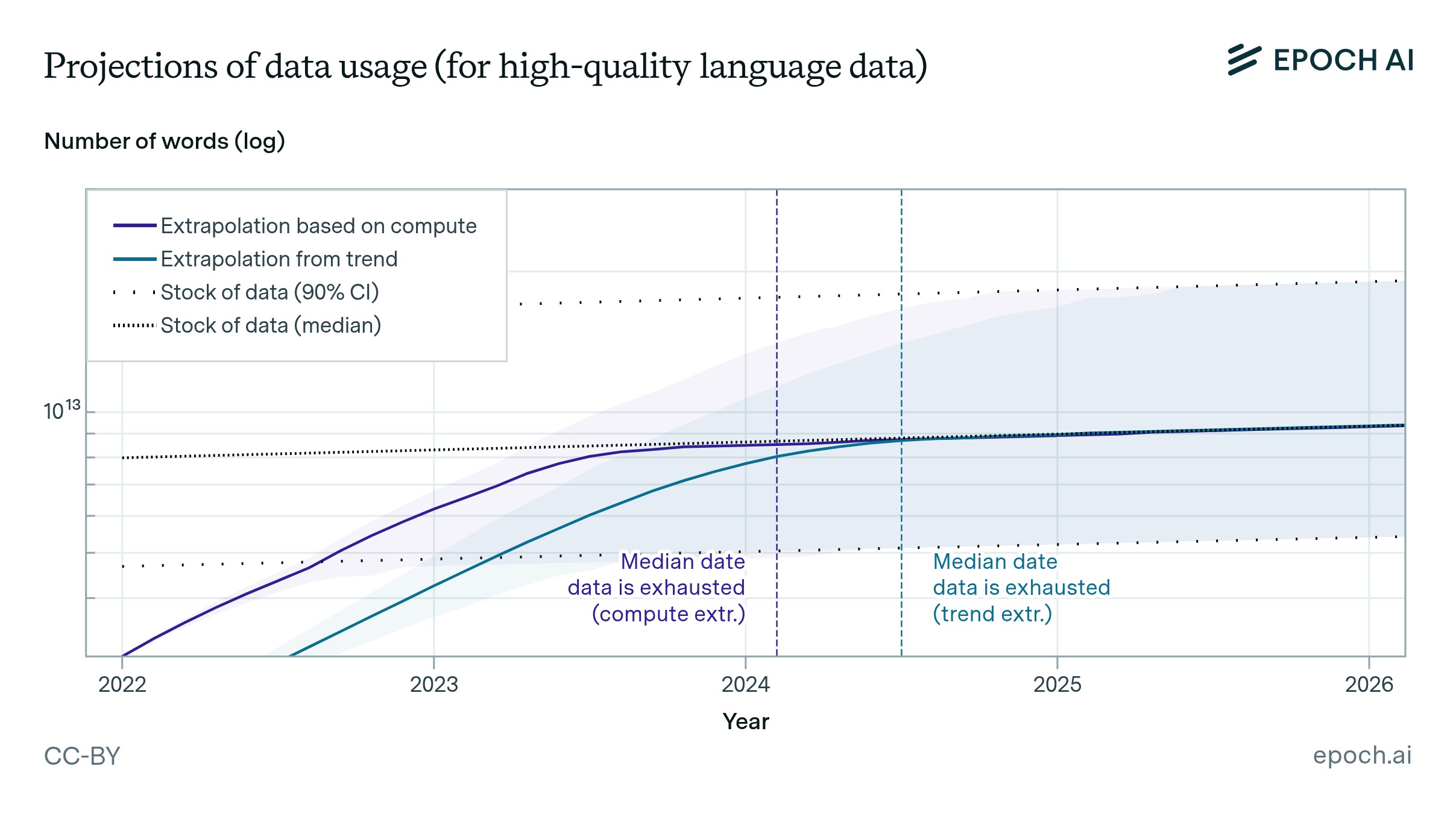 We estimate the total stock of English language and image data in future years using a series of probabilistic models. For language, in addition to the total stock of data, we estimate the stock of high-quality language data, which is the kind of data commonly used to train large language models.
