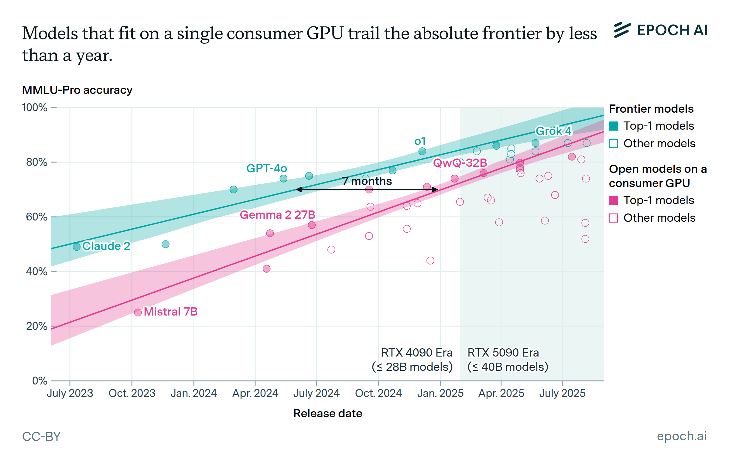 Using a single top-of-the-line gaming GPU like NVIDIA’s RTX 5090 (under $2500), anyone can locally run models matching the absolute frontier of LLM performance from just 6 to 12 months ago. This lag is consistent with our previous estimate of a 5 to 22 month gap for open-weight models of any size. However, it should be noted that small open models are more likely to be optimized for specific benchmarks, so the “real-world” lag may be somewhat longer.