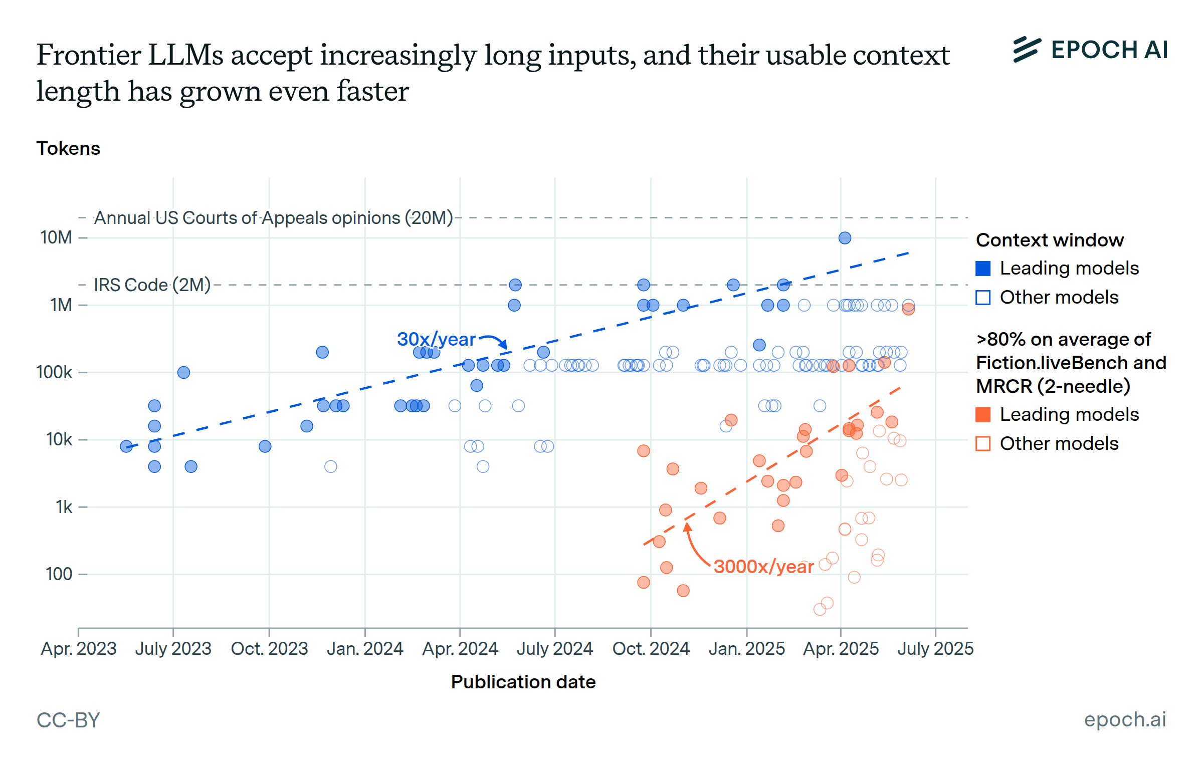 Today’s LLMs can only ingest a limited number of tokens per query, often called the context window. Since mid-2023, the longest LLM context windows have grown by about 30x per year. Their ability to use that input effectively is improving even faster: on two long-context benchmarks, the input length where top models reach 80% accuracy has risen by over 250x in the past 9 months.