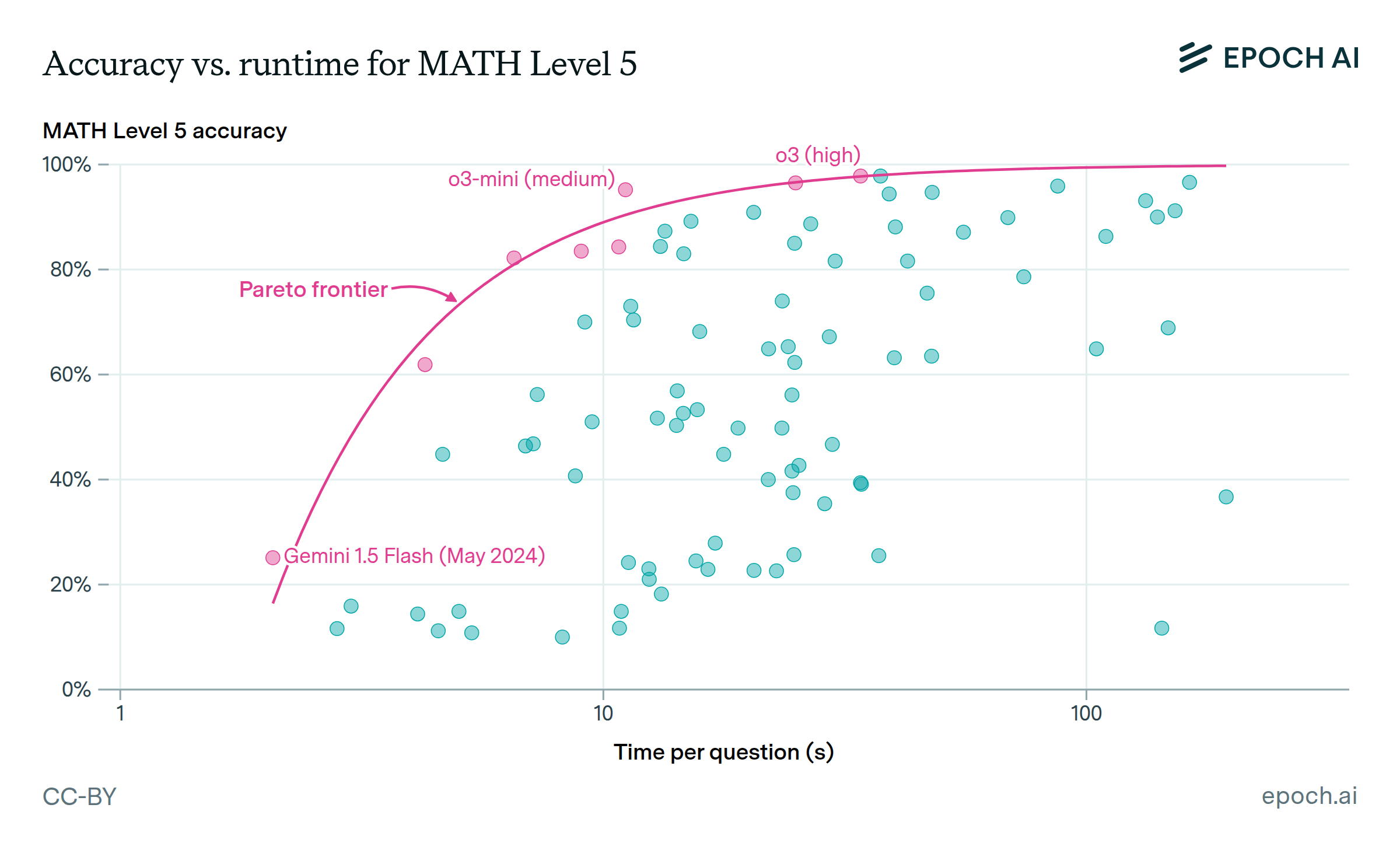 Data for runtime and accuracy comes from Epoch’s Benchmarking Hub. We focus on the benchmarks with highest coverage across models. These benchmarks all have a simple question-answering format which does not call for any agentic scaffolding or multi-turn interactions. Thus, runtime data reflects a single API call per sample. Models are typically sampled 8 times on GPQA Diamond and OTIS Mock AIME. Models are typically sampled 4 times on MATH Level 5, due to the larger size of this benchmark. In a few cases, due to cost or API instability, models are sampled only 1 time per question.