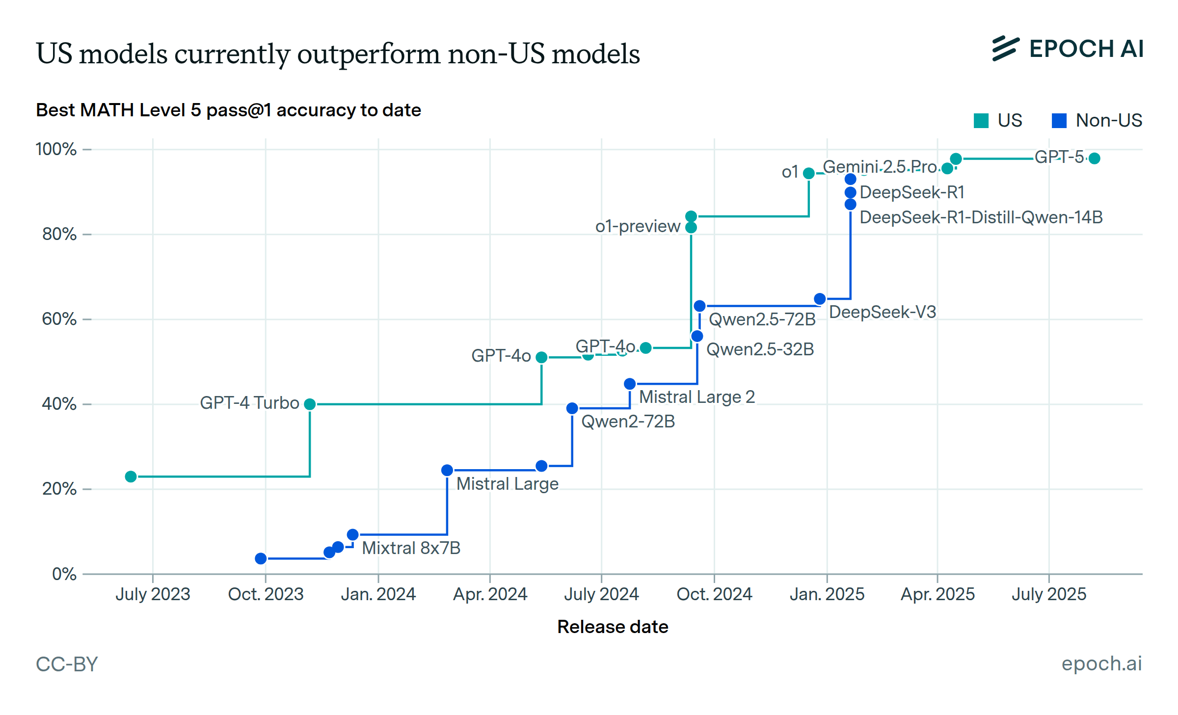 However, with the release of DeepSeek-R1 in January 2025, the gap between US and non-US models has reduced substantially: DeepSeek-R1 trails behind o3-mini by only 2 percentage points on MATH Level 5, and scores only 4 percentage points lower than o1 on GPQA Diamond.