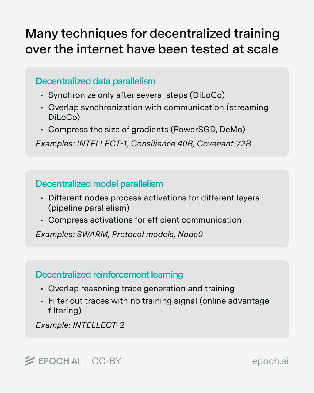But Pluralis, Prime Intellect and Nous Research have already trained (and postrained) models with billions of parameters. The key is in a family of techniques to reduce bandwidth requirements, and enable different kinds of decentralized training: data parallelism, model parallelism, and RL training.
