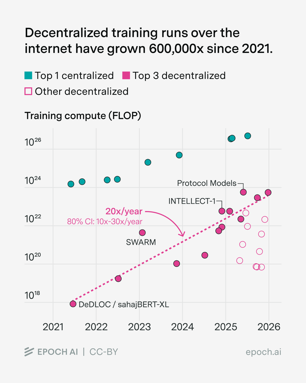 While they are relatively small for the moment, it is worth appreciating that the scale of decentralized training runs has grown astoundingly fast. Since 2020, we have seen a 600,000x increase in the computational scale of decentralized training projects, for an implied growth rate of about 20x/year.