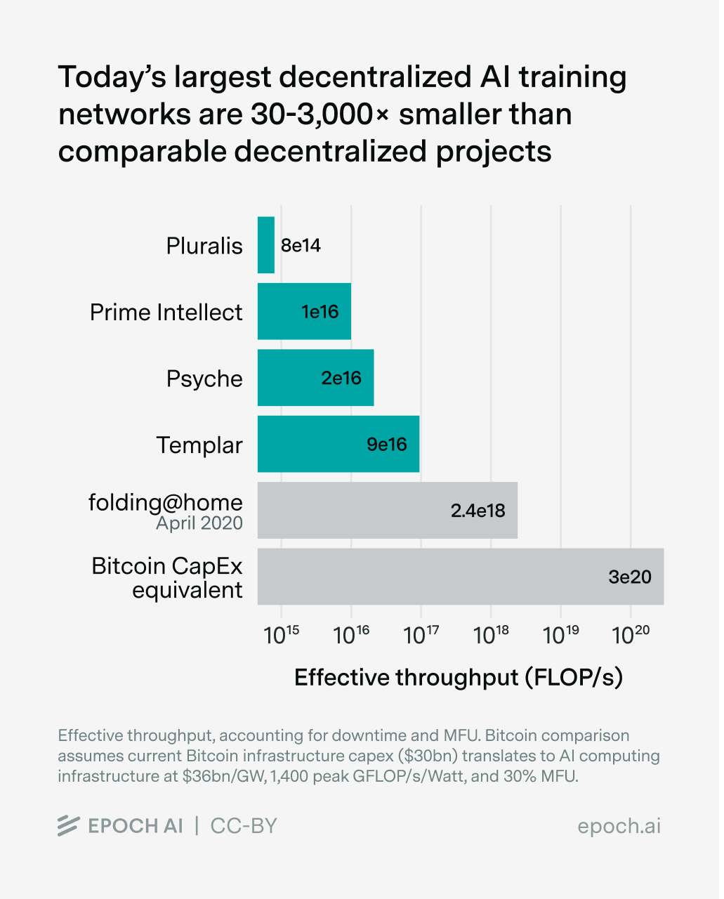 In order to train them, decentralized networks have been set up, such as Prime Intellect’s platform, the Psyche Network by Nous Research, and the Pluralis dashboard. The largest such active network we’ve found is Covenant AI’s Templar, which is currently achieving an effective throughput of 9e17 FLOP/s respectively. This is about 300x smaller than frontier AI datacenters today, which have a theoretical training throughput of about 3e20 effective FLOP/s (eg the Microsoft Fairwater Atlanta site, assuming 30% MFU and 8-bit training).