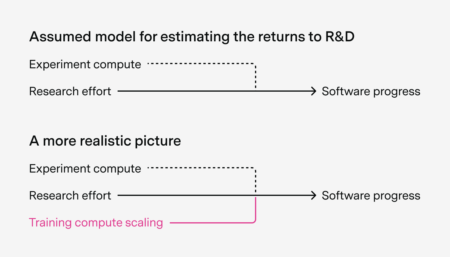 Instead, existing models either assume that research effort is the only thing that matters, or assume that it depends on a mix of research effort and the compute used to run experiments.26 But to my knowledge, none explicitly account for training compute scaling being a source of software progress, so they could heavily overstate the importance of research effort.