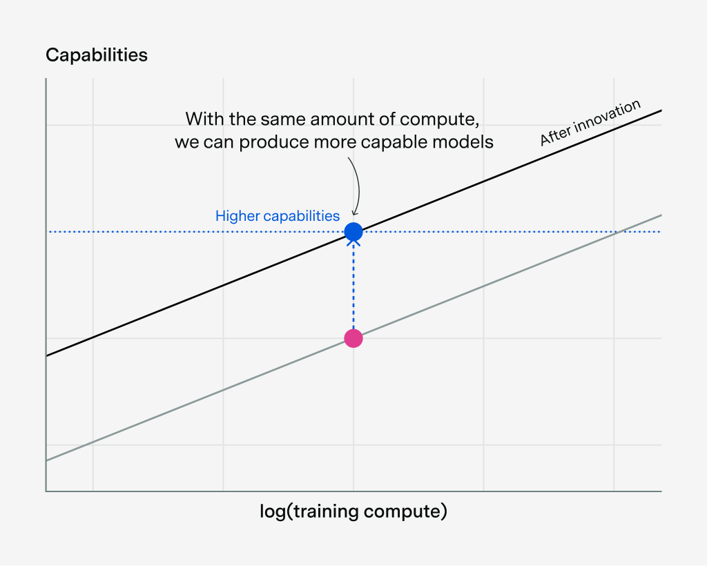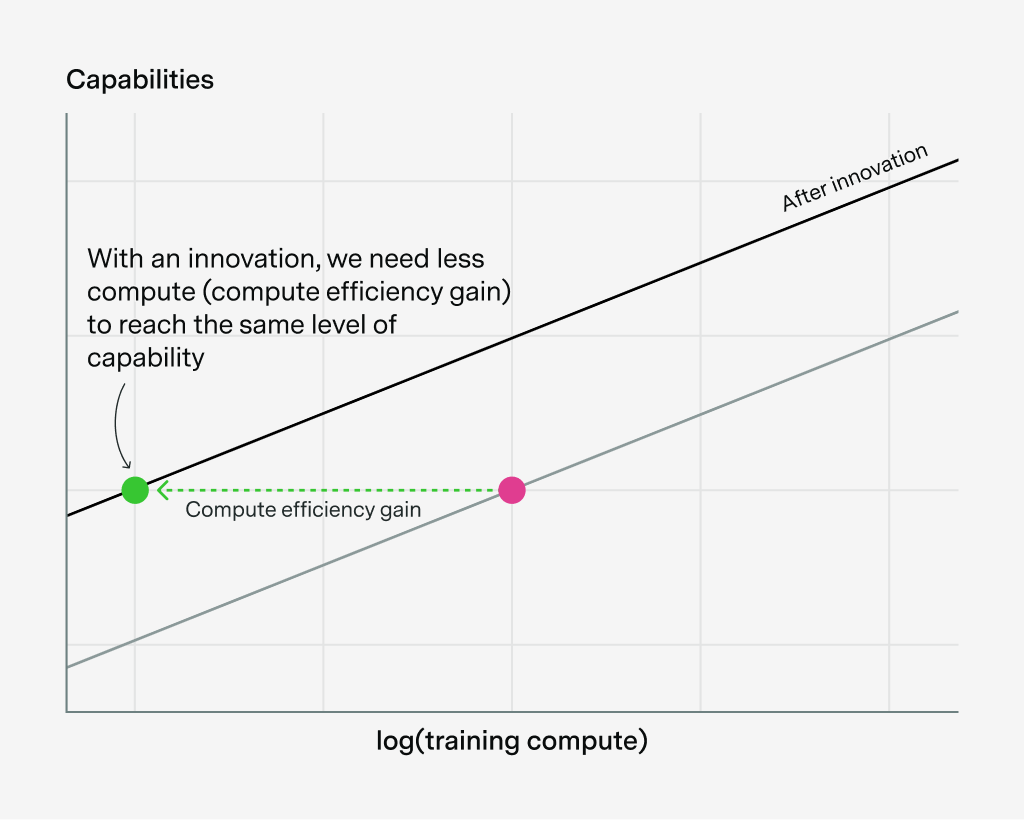 This is why researchers often define the “effective compute” = “compute efficiency gain” × training compute. Because of the software innovation, we in effect have a larger compute budget that we can use to reach higher levels of capability. We can do more with the compute we currently have.4