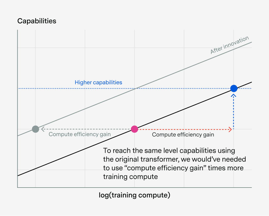 If we had wanted to reach that blue level of capabilities using the original transformer, we would’ve needed to use “compute efficiency gain” times more training compute: