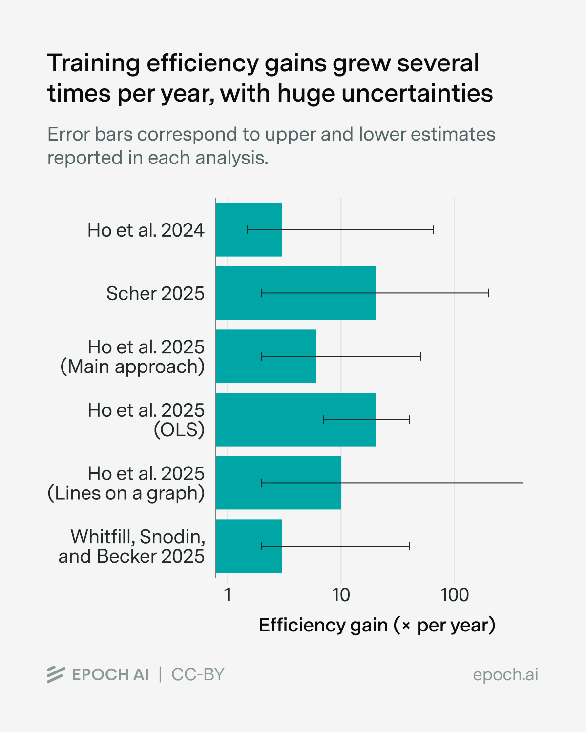 | Ho et al. 2025 | Mostly pre-training | Main approach yields 6× per year (95% CI ranges from 2× to 50× across different model families). An alternative approach using OLS yields 20× per year (95% CI: 7× to 40×). A “direct observation” approach yields a central estimate of 10× per year, with estimates ranging from 2× to 400× per year. | Statistical model, lines on a graph |