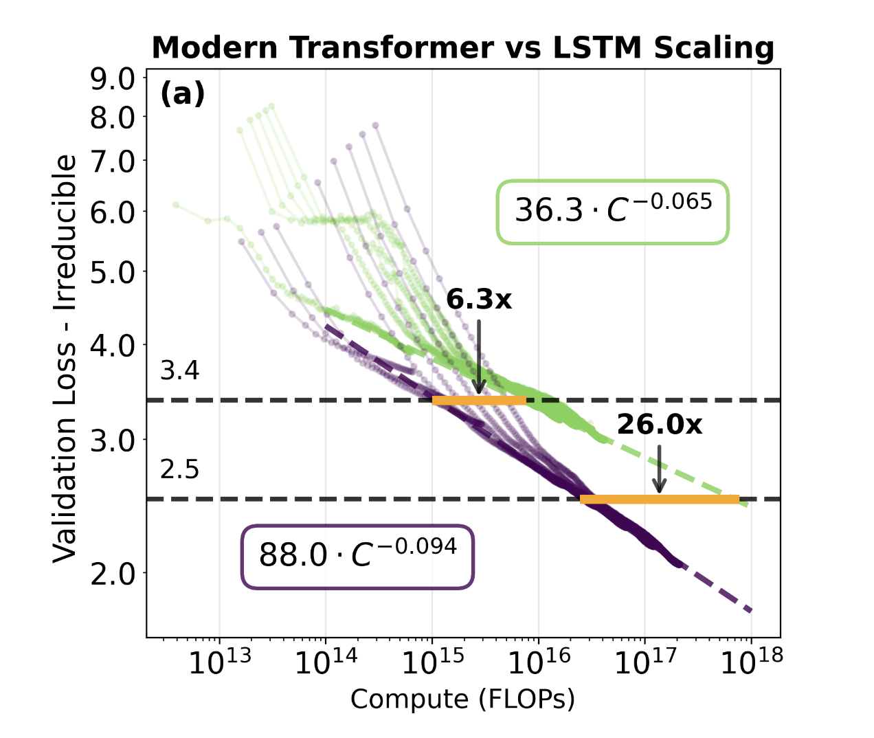 The most direct evidence for this is the paper On the Origin of Algorithmic Progress in AI.16 Here’s one example where they compare the scaling of a modern Transformer architecture (purple) and an old-school LSTM (green):