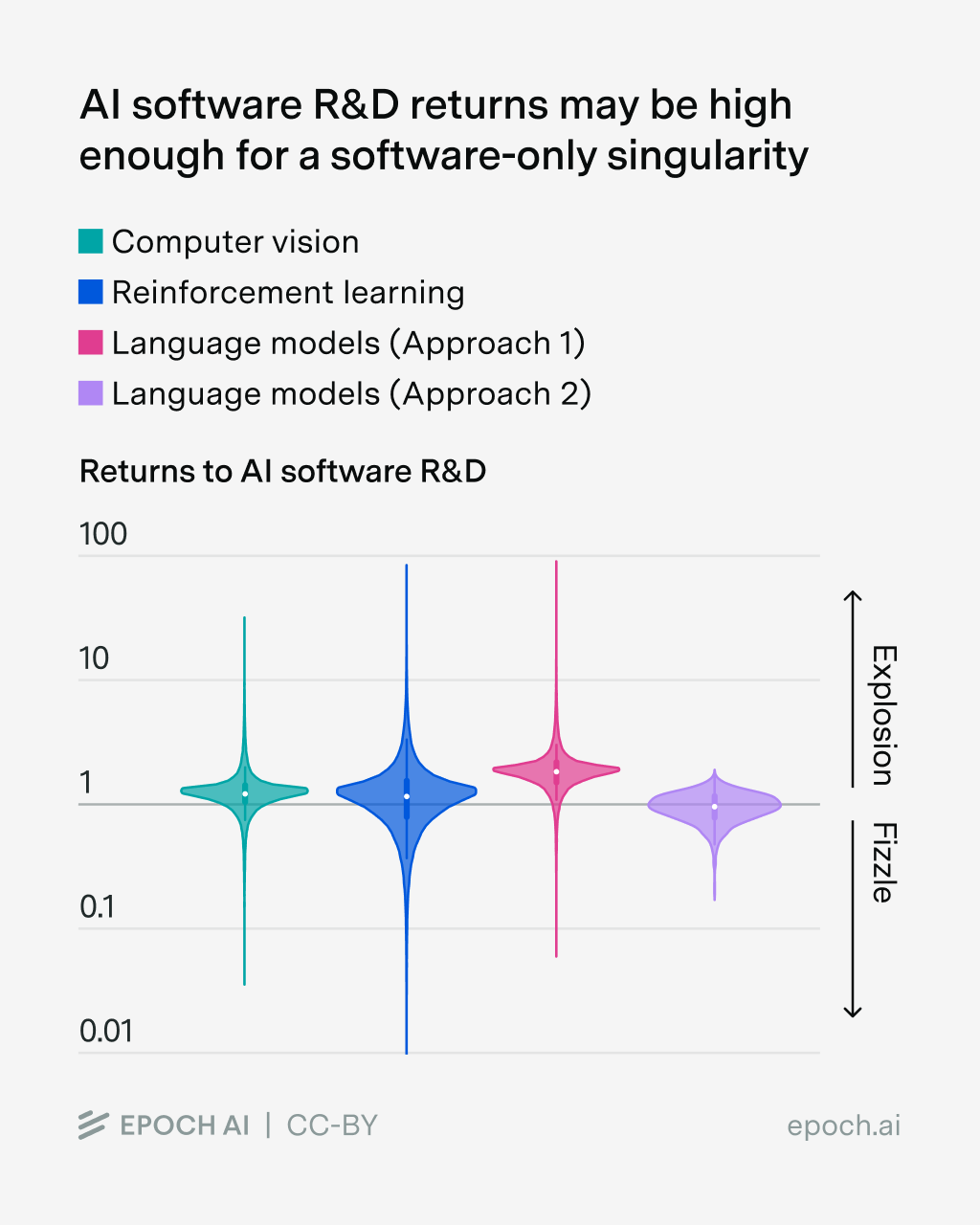 (Source) Estimates of the returns to AI software R&D are very uncertain but straddle 1. This suggests that an intelligence explosion is plausible, but it’s also plausible that the feedback loop of AIs improving themselves simply fizzles out.