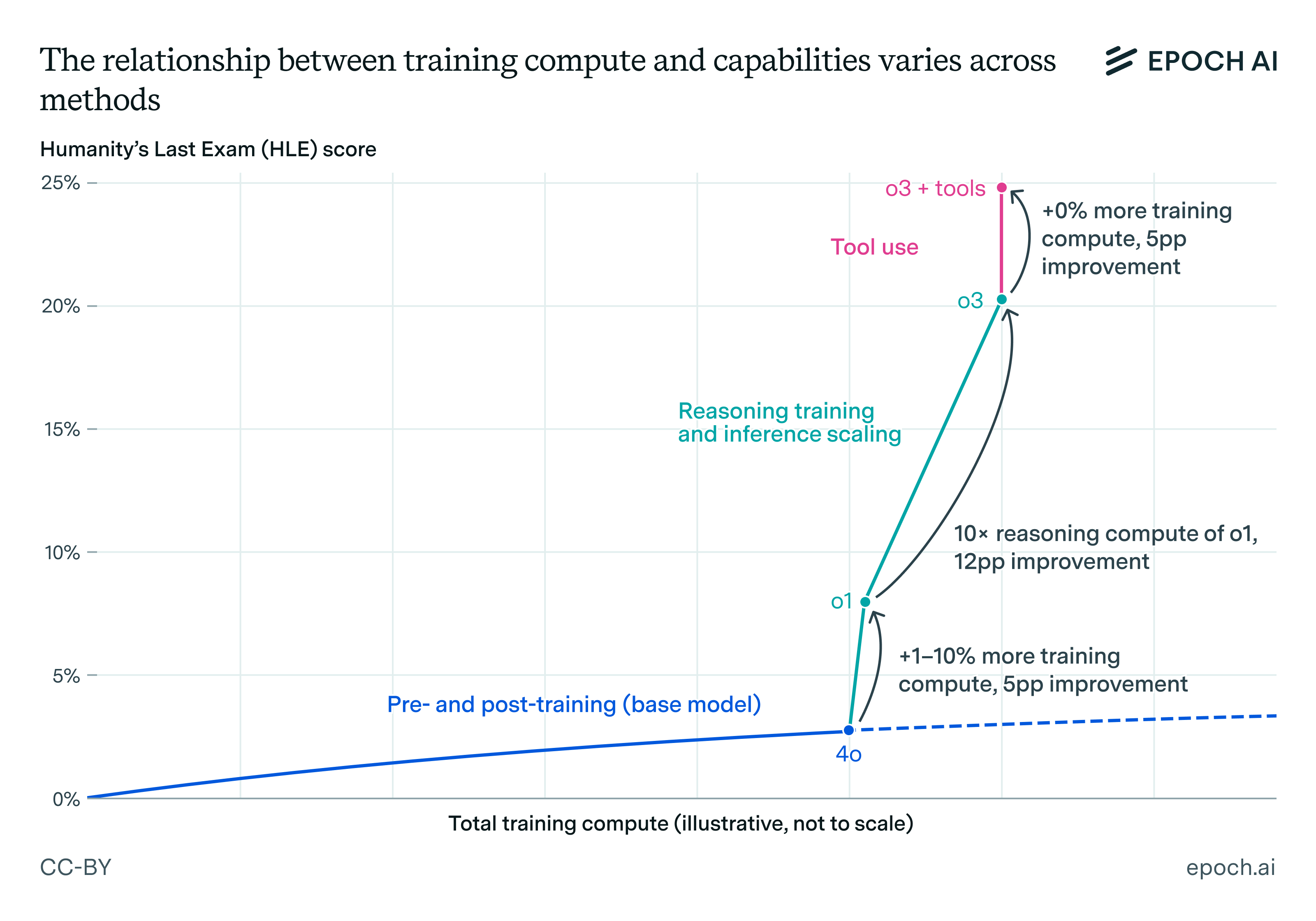 - Not all uses of compute contribute equally to model capabilities: For example, recent “reasoning training” methods during post-training often yield higher capability gains compared to other post-training interventions, per unit of computation.