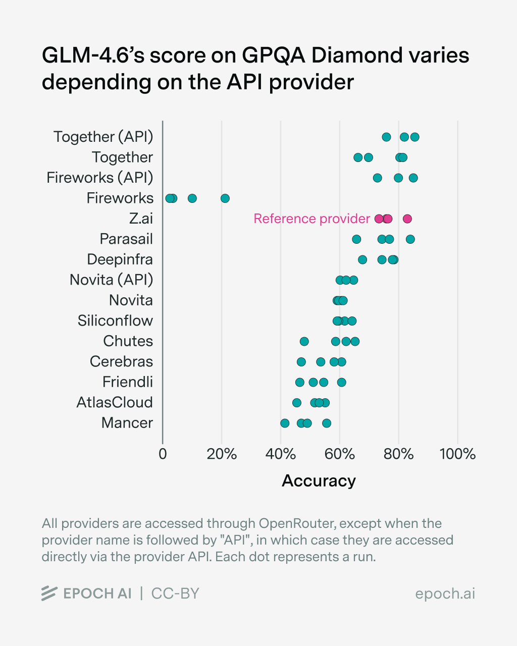 Aside from these errors, we find that providers are noticeably worse at serving newer models, in our case GLM-4.6, compared to established models such as Qwen3. This is consistent with other model releases, which are accompanied by bugs that are then fixed over time. However, independent benchmark organizations want to evaluate new models as soon as possible.