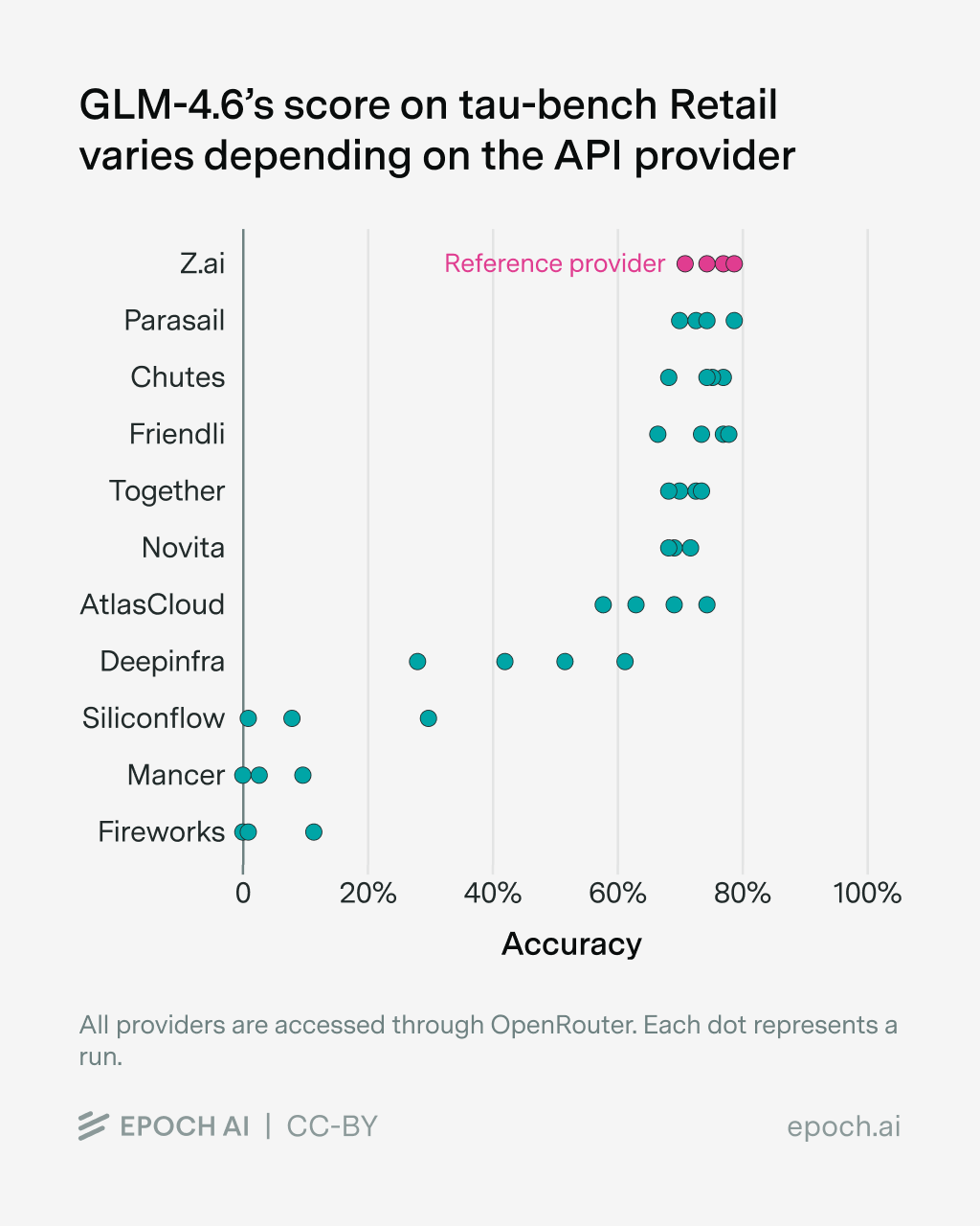 We evaluated GLM-4.6 (as both the agent and the user model) on tau-bench Retail while varying the API provider (keeping the same provider for both agent and user), while keeping everything else the same.