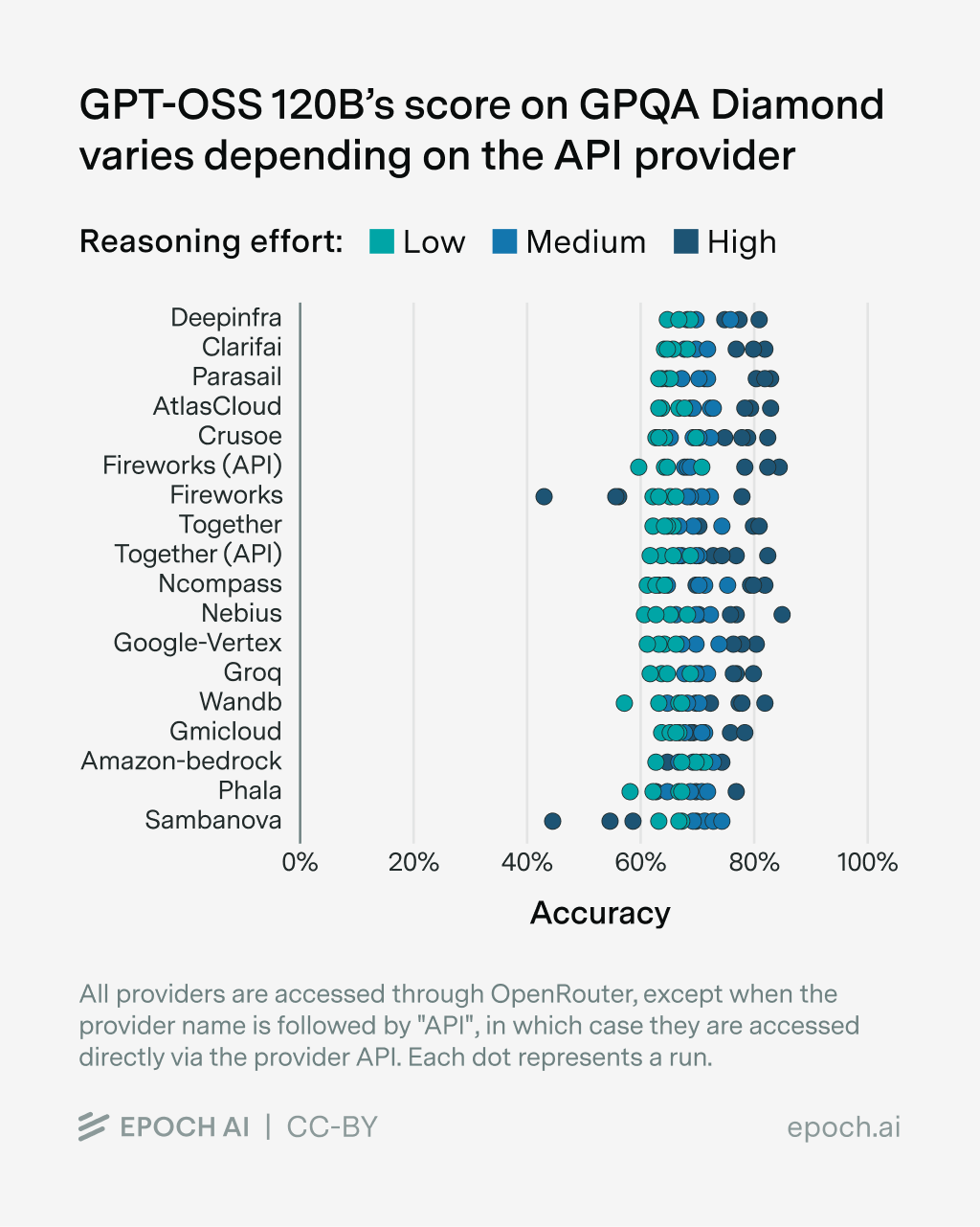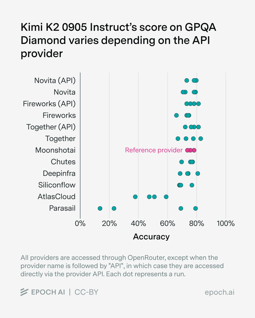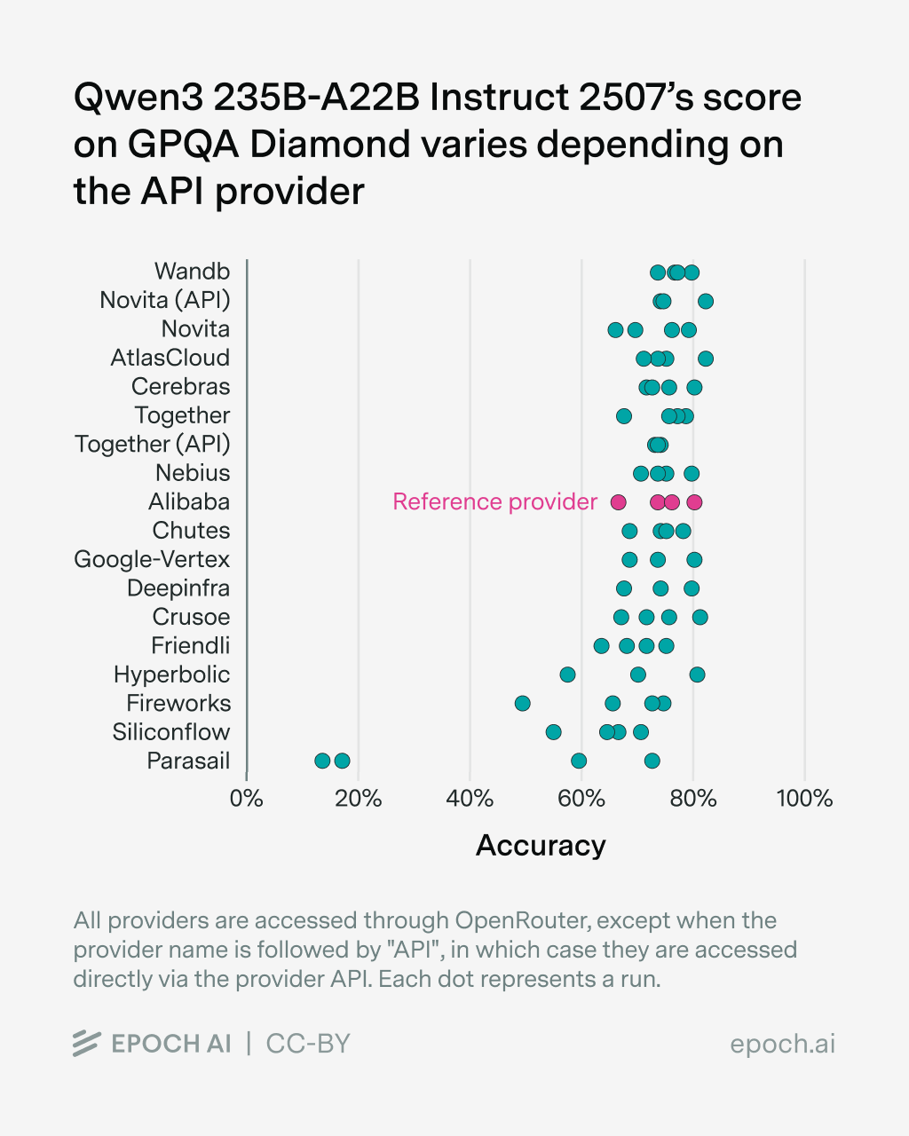 The selection of an appropriate provider has the biggest impact on model performance. The model developer usually hosts their own API, which could serve as a reference. However, this hosted API often offers worse data security guarantees than third-party APIs, so evaluators might prefer not to use it for private benchmarks.
