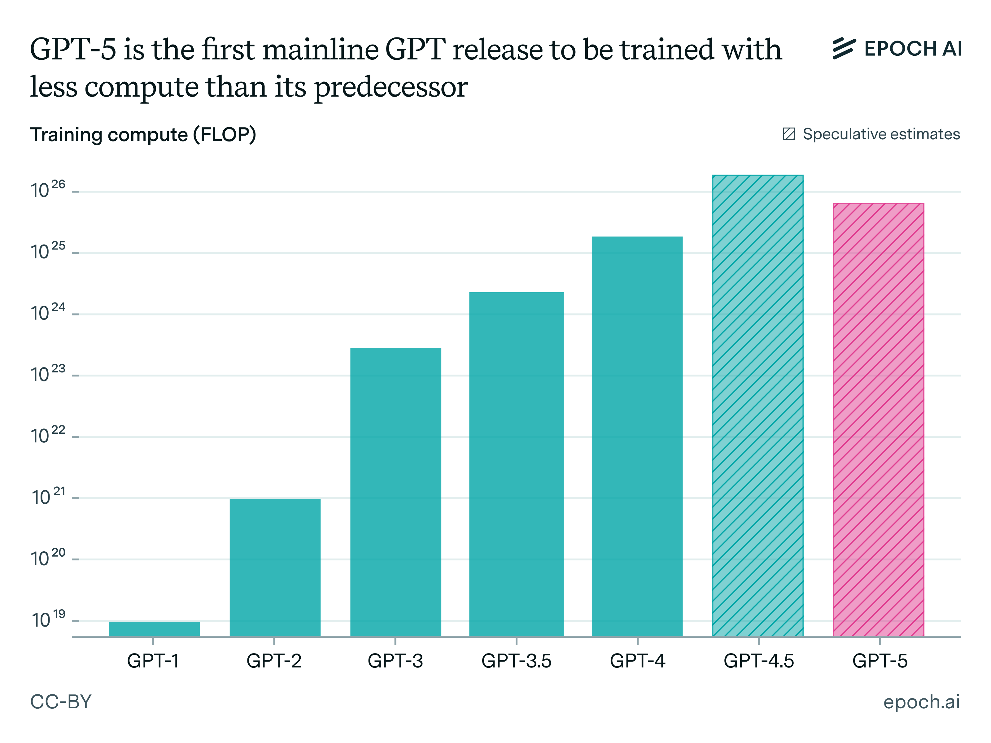 Out of all the GPT models, GPT-5 is the odd one out. Unlike all previous versions of GPT, it was likely trained on less compute than its immediate predecessor, GPT-4.5.1